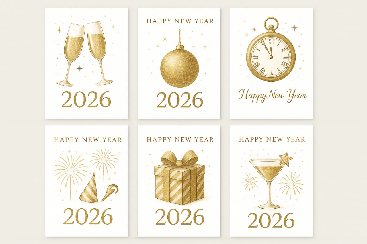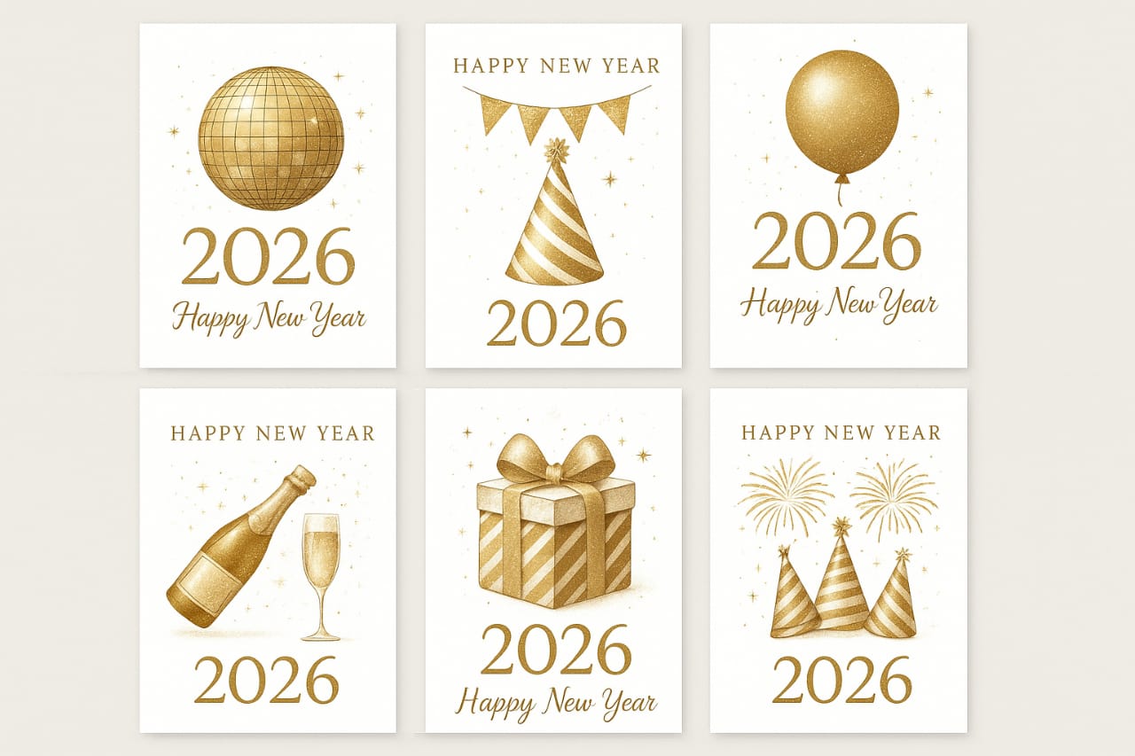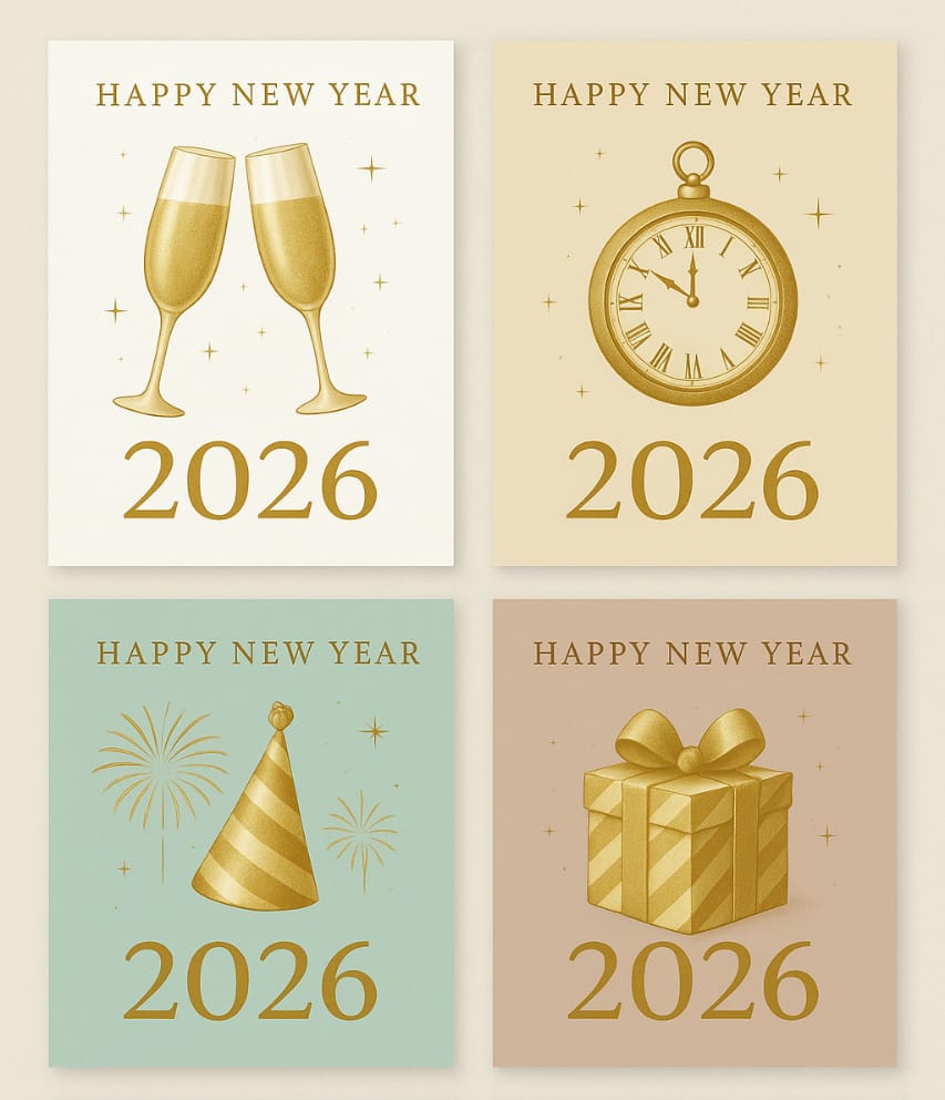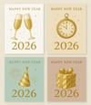 Each card features an elegant gold illustration and “Happy New Year 2026” message.