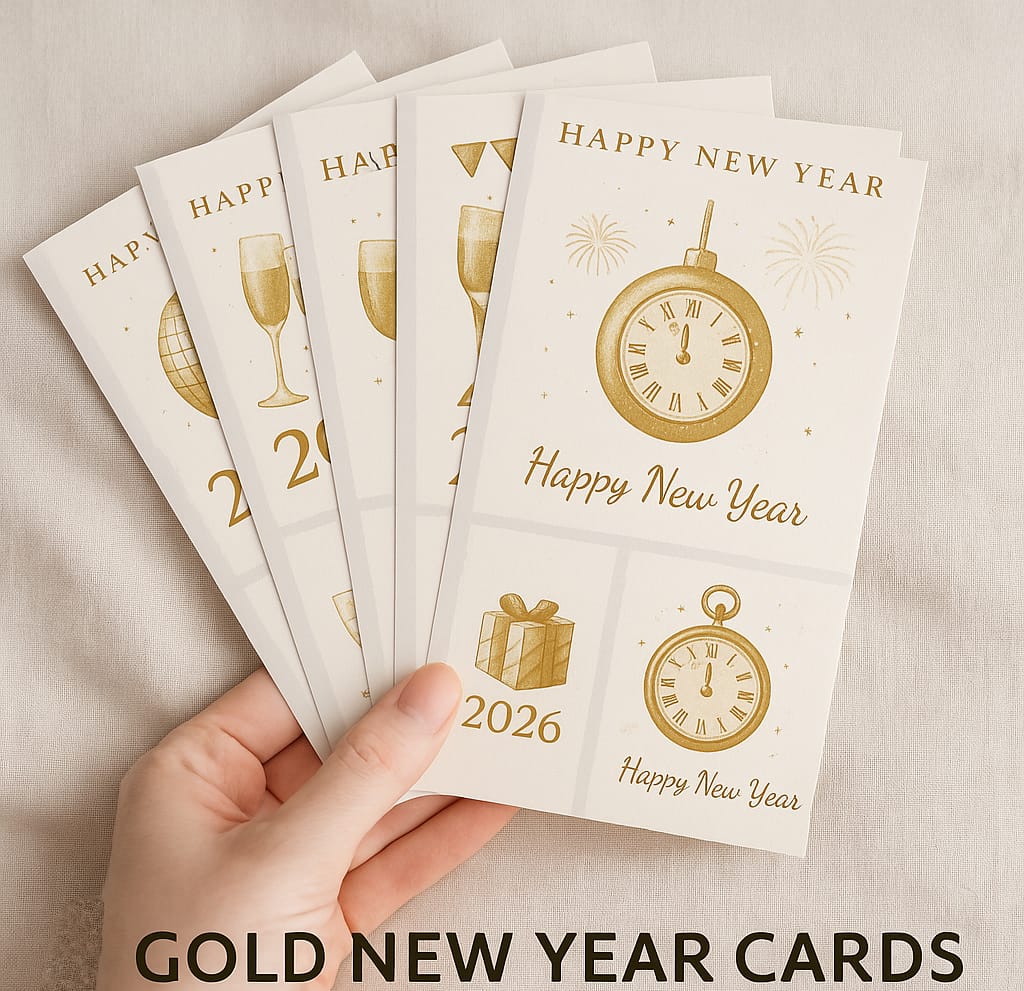 Celebrate the New Year in style with this beautifully designed set of 6 premium gold-themed greeting cards. Perfect for gifting family, friends, colleagues, and customers. These digital cards come ready to print at high resolution.