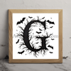 The letter G coloring book halloween occupying 90% of a 1024x1024 image. Use an Old English font style with clear outlines resembling a coloring book page. The character is composed of intricate bat silhouettes, creating a spooky Halloween atmosphere. Use only pure black (#000000) for the character and outlines, and white for the background.2D, black and white style resembling a high-quality adult coloring book page.