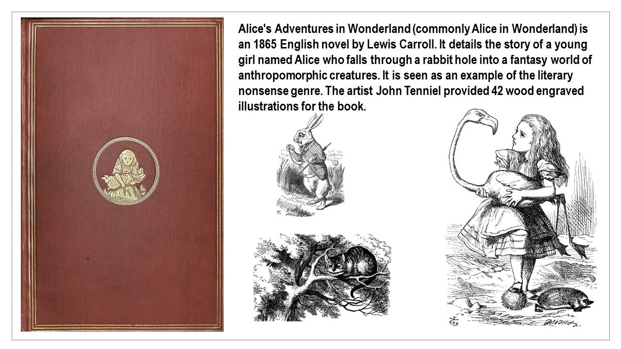 Alice's Adventures in Wonderland (commonly Alice in Wonderland) is an 1865 English novel by Lewis Carroll. It details the story of a young girl named Alice who falls through a rabbit hole into a fantasy world of anthropomorphic creatures. It is seen as an example of the literary nonsense genre. The artist John Tenniel provided 42 wood engraved illustrations for the book.