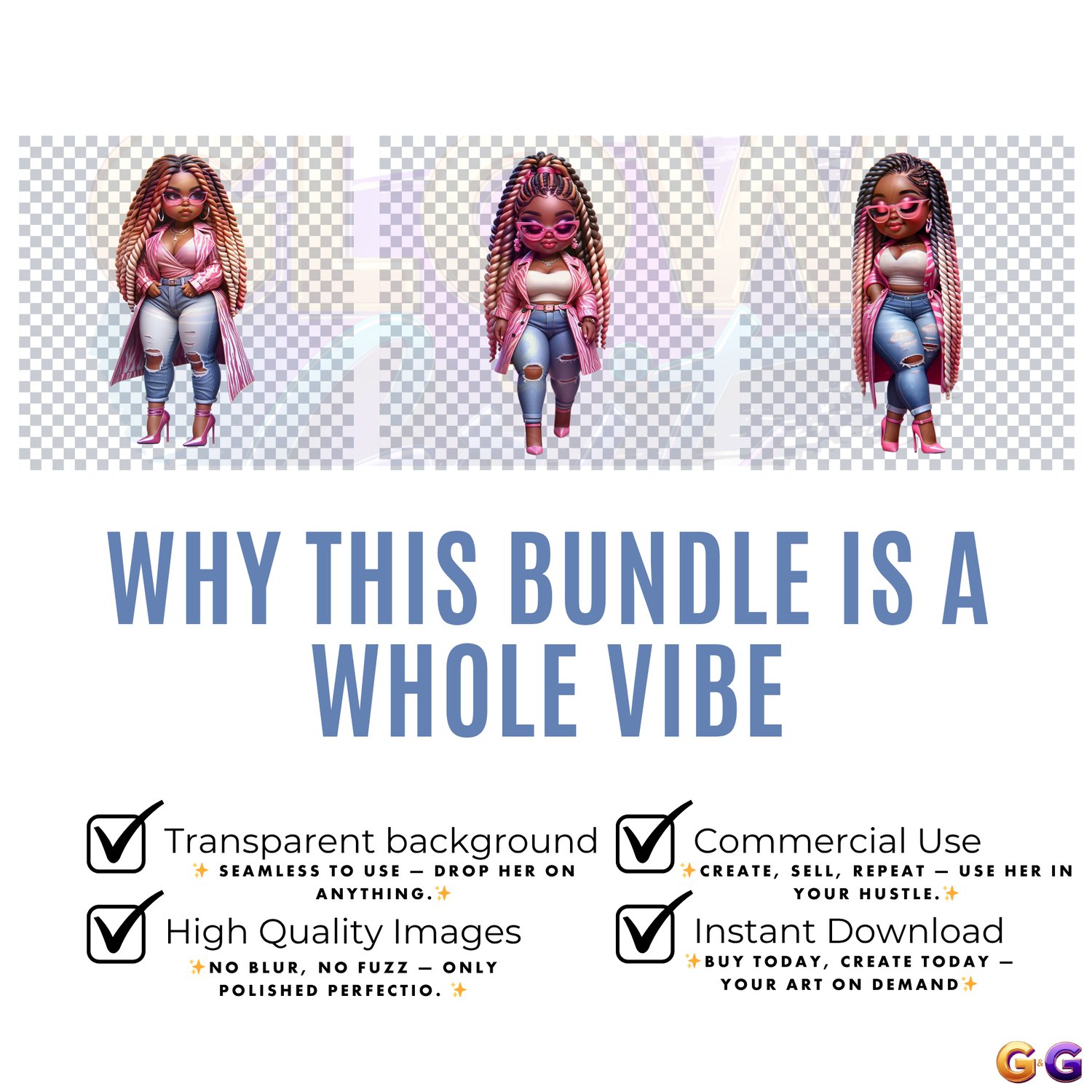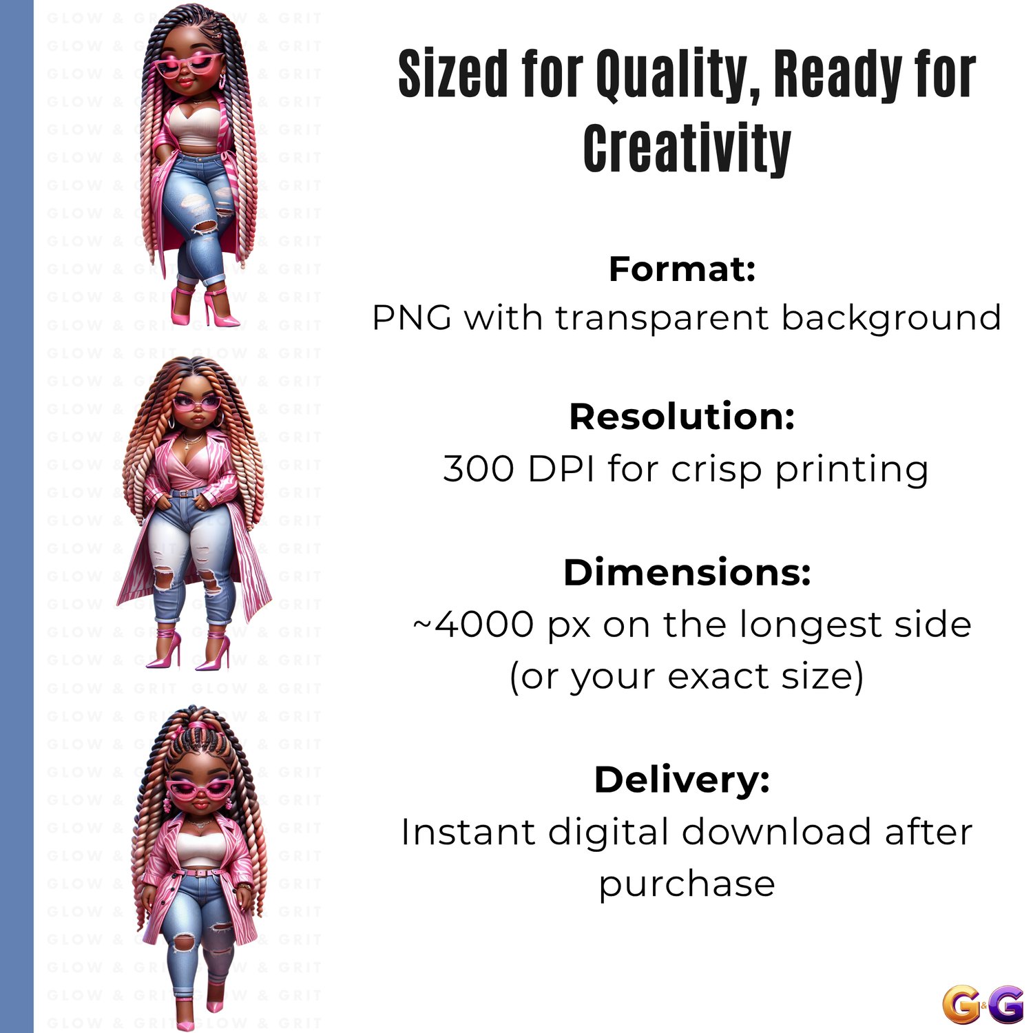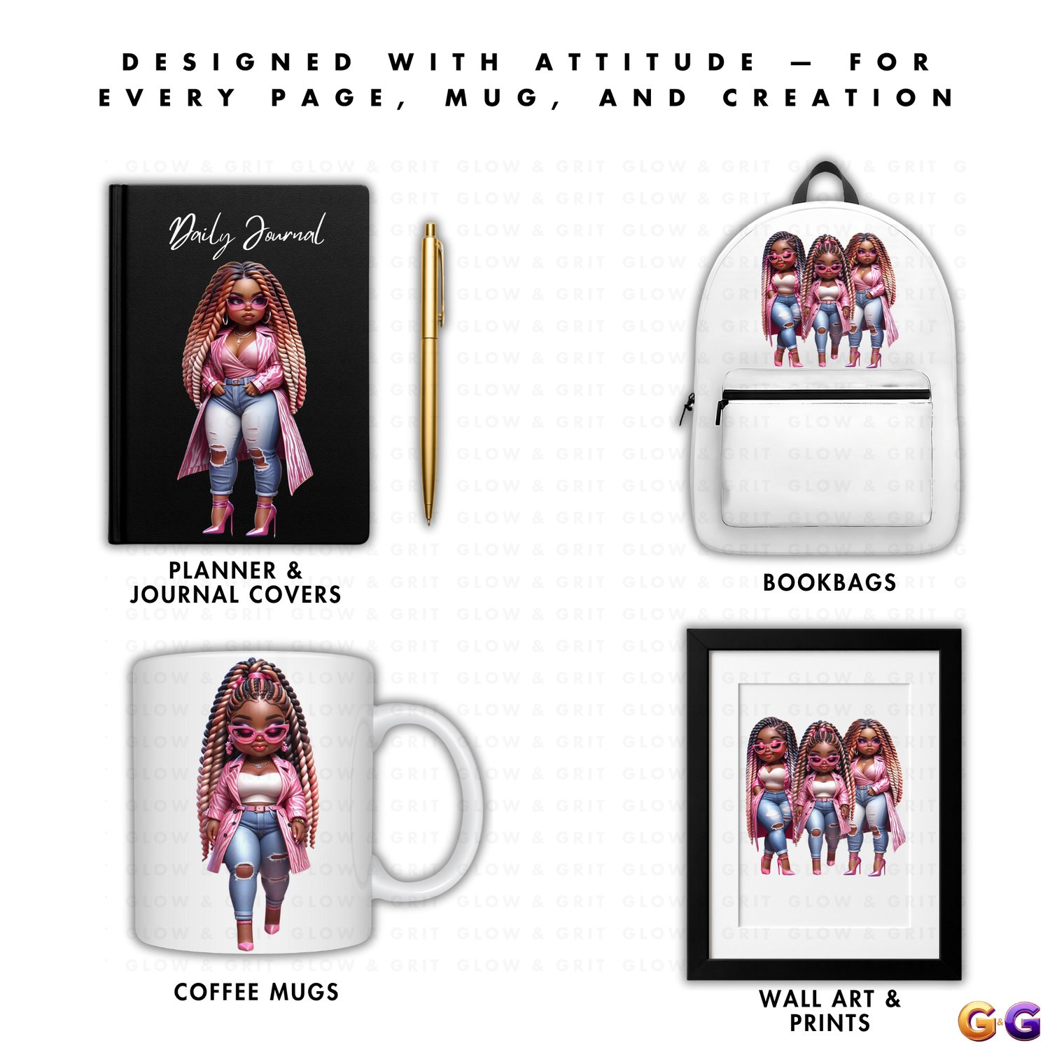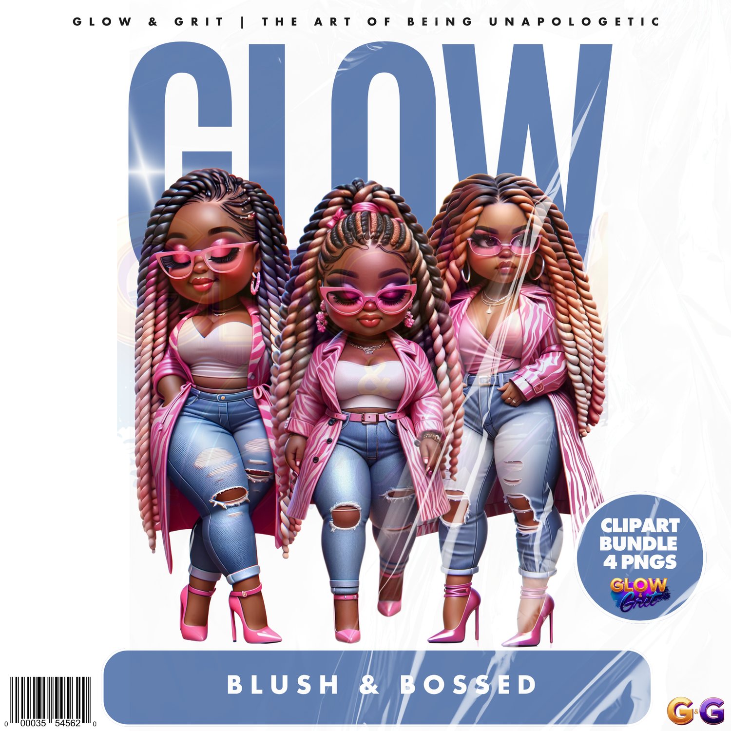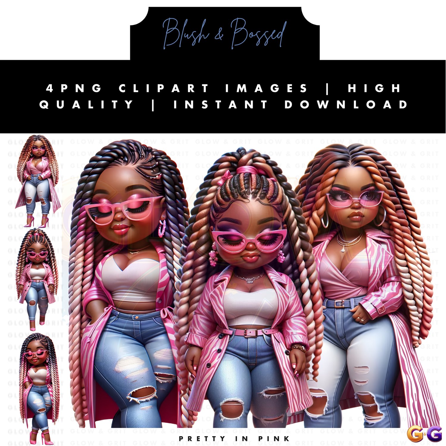 Step into your soft era with Blush & Bossed, a radiant clipart collection that blends sweet femininity with unstoppable confidence. These glossy Afrocentric dolls serve pink perfection with attitude, featuring luxe details that elevate any project. Perfect for planners, journals, wall art, merch, and digital designs that celebrate power in every shade of pretty.