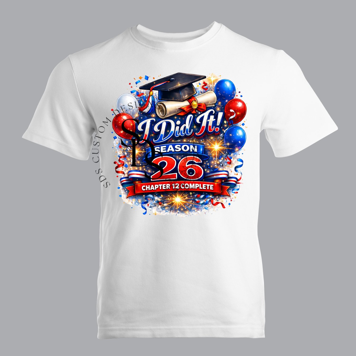 Celebrate graduation with bold red, white, and blue pride using this vibrant “I Did It – Season 26, Chapter 12 Complete” PNG design! Featuring a graduation cap, diploma, festive balloons, sparkling fireworks effects, and patriotic color accents, this high-resolution transparent graphic is perfect for honoring the Class of 2026 in standout style.