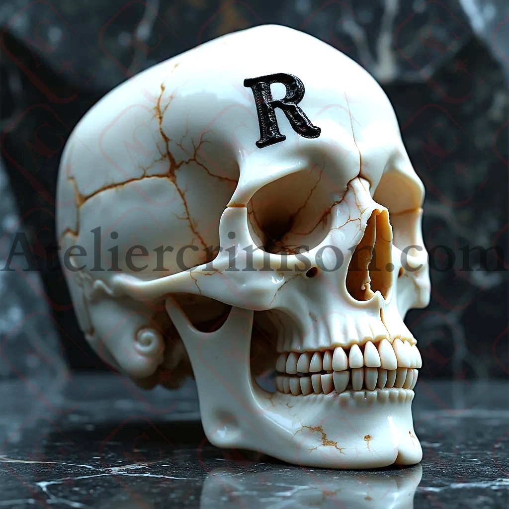 The letter R skull obsidian marble deeply engraved character on the forehead of a white marble skull. The character, filled with dark obsidian, contrasts sharply against the pale skull. Set against a black crystalline background, the skull and character dominate the image.