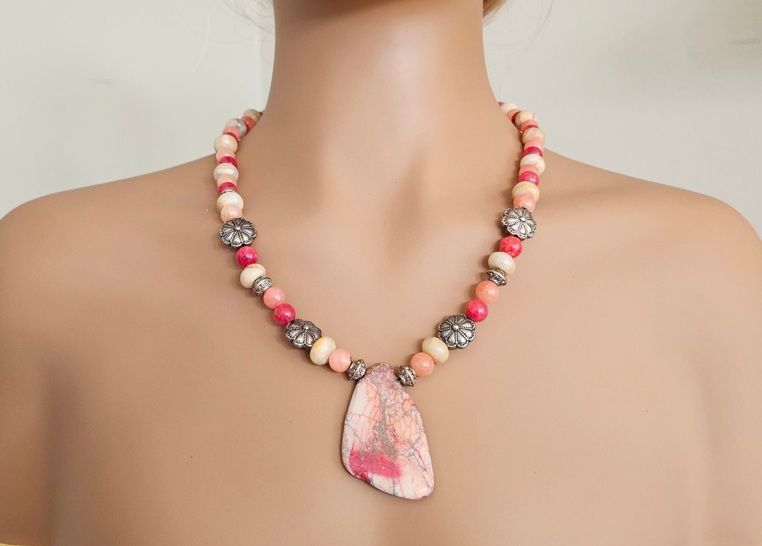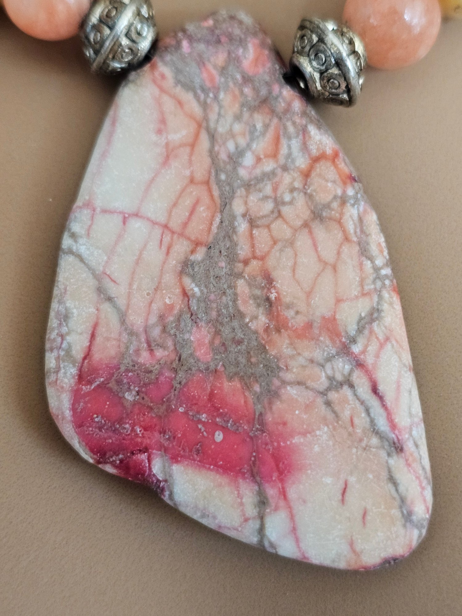 Peach and pink stone beads with slice of stone