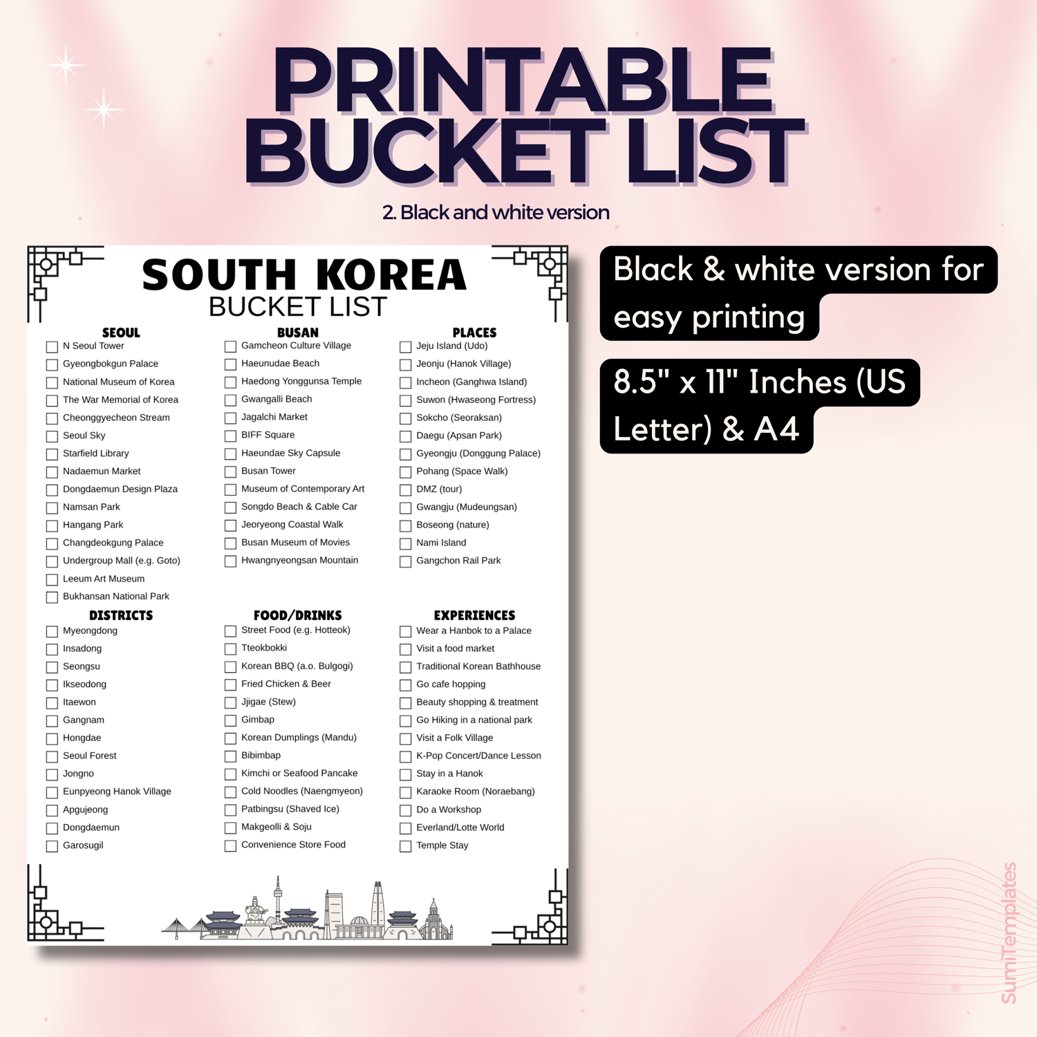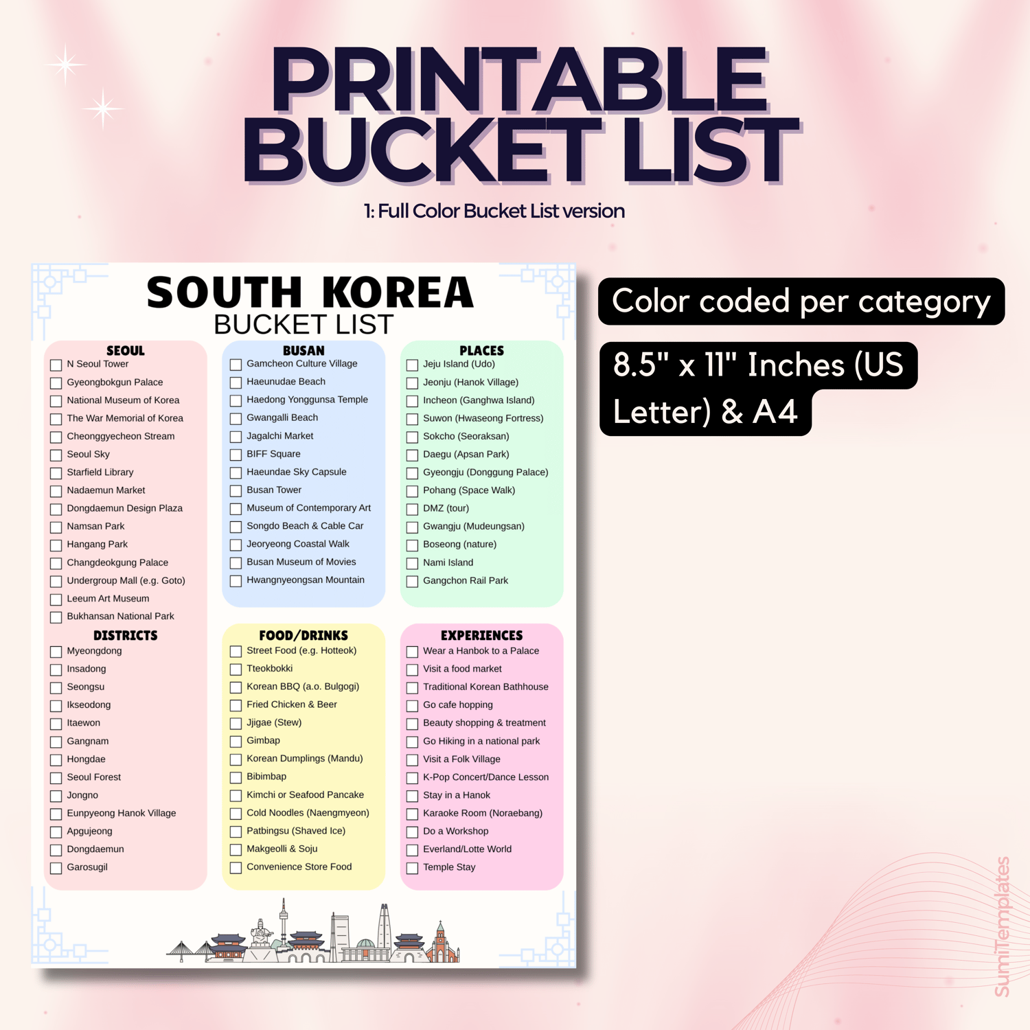 Plan your Korean travel with this fun color coded bucket list. Designed to capture your Korea travel highlights for the trip of a lifetime. This unique item is a must for those who wish to keep their itinerary organized and handy.