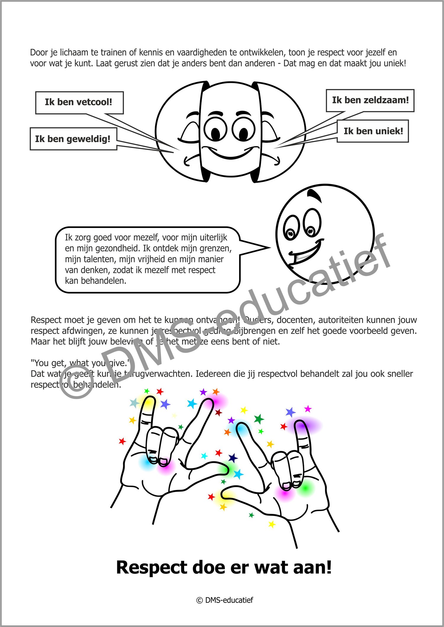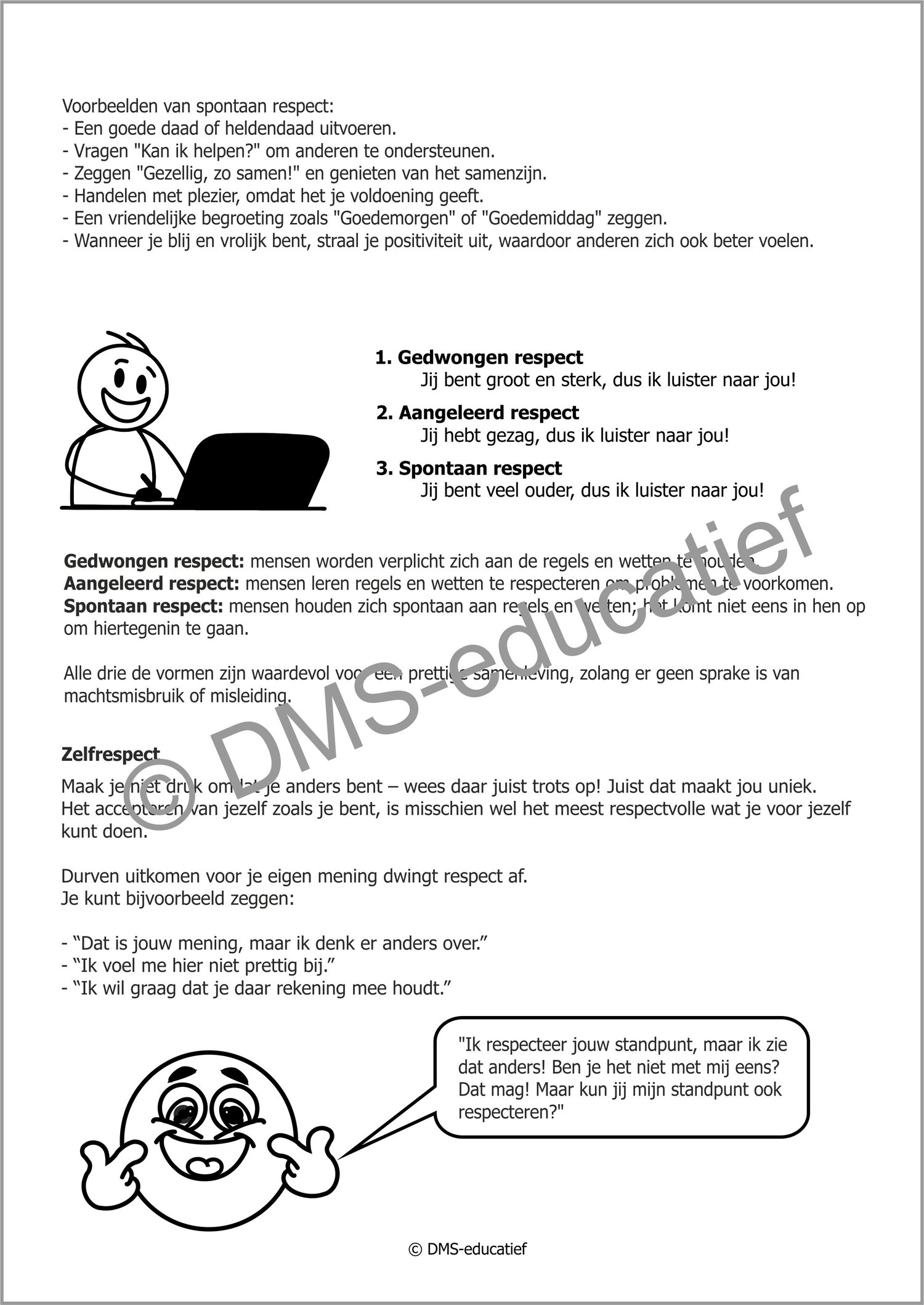 Het werkboekje maakt onderscheid tussen gedwongen, aangeleerd en spontaan respect, en helpt leerlingen nadenken over hun eigen houding en gedrag. Door herkenbare voorbeelden, reflectieve opdrachten en een inspirerend verhaal (De truc met de diamant) krijgen leerlingen inzicht in het belang van wederzijds respect. Er is ook aandacht voor zelfrespect, meningsverschillen en cultuurverschillen.