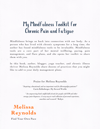 In this eBook, author, blogger, yoga teacher, and chronic illness thriver Melissa Reynolds share dozens of practices that you might like to add to your daily management plans. You will learn many practical techniques to add to your symptom management plans. To help you rest, relax and even strengthen your body. It includes worksheets to create your own flare plan, pain management plan and work management plans. It's a must read for the chronic pain and fatigue community.