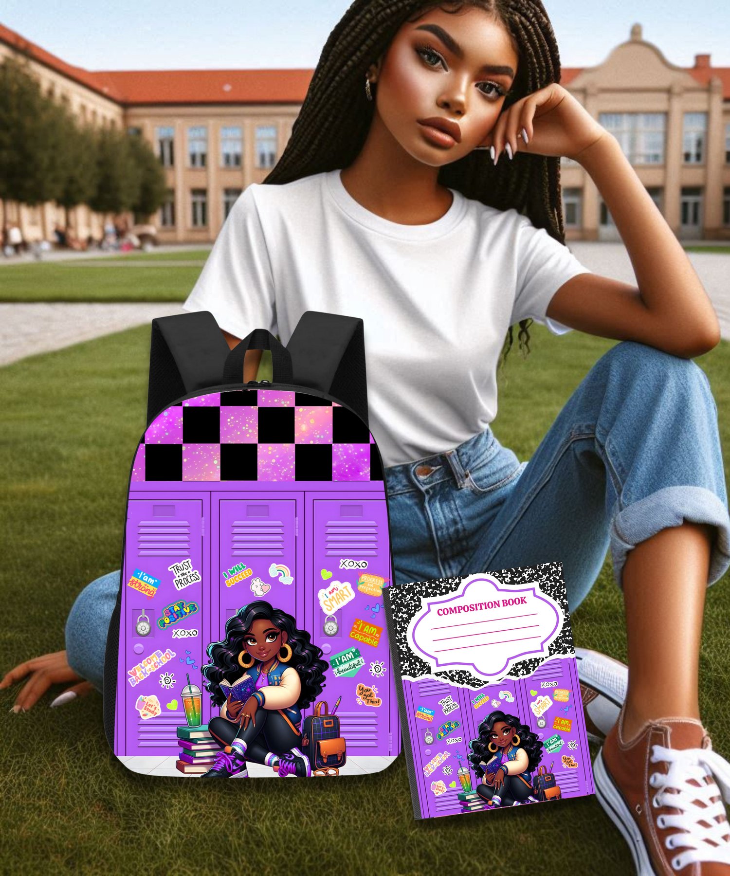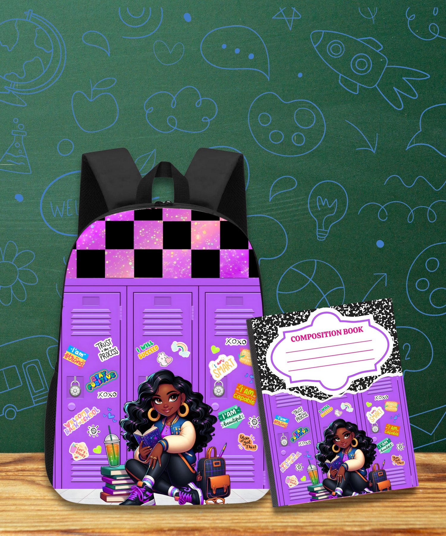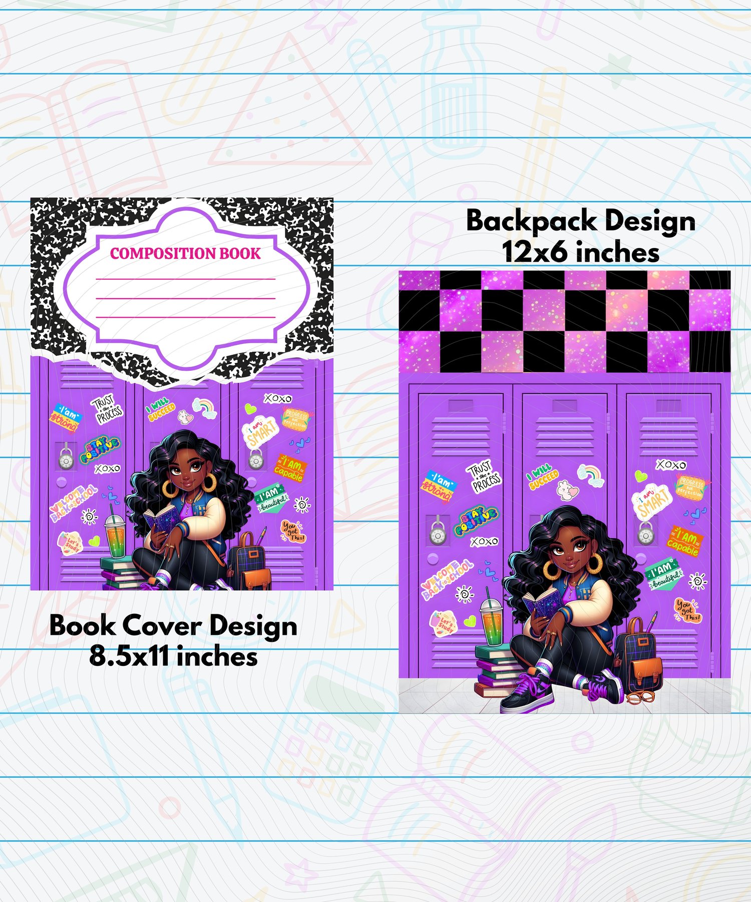 This set features a sassy Black girl character posted up by her locker, surrounded by fun, colorful Y2K-style stickers and school day essentials. It’s giving confidence, it’s giving attitude, and it’s giving main character energy all year long!