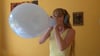 Annie challenges herself to blow to pop a blue balloon. She gets really excited to pop it, but uses ear protection just in case.