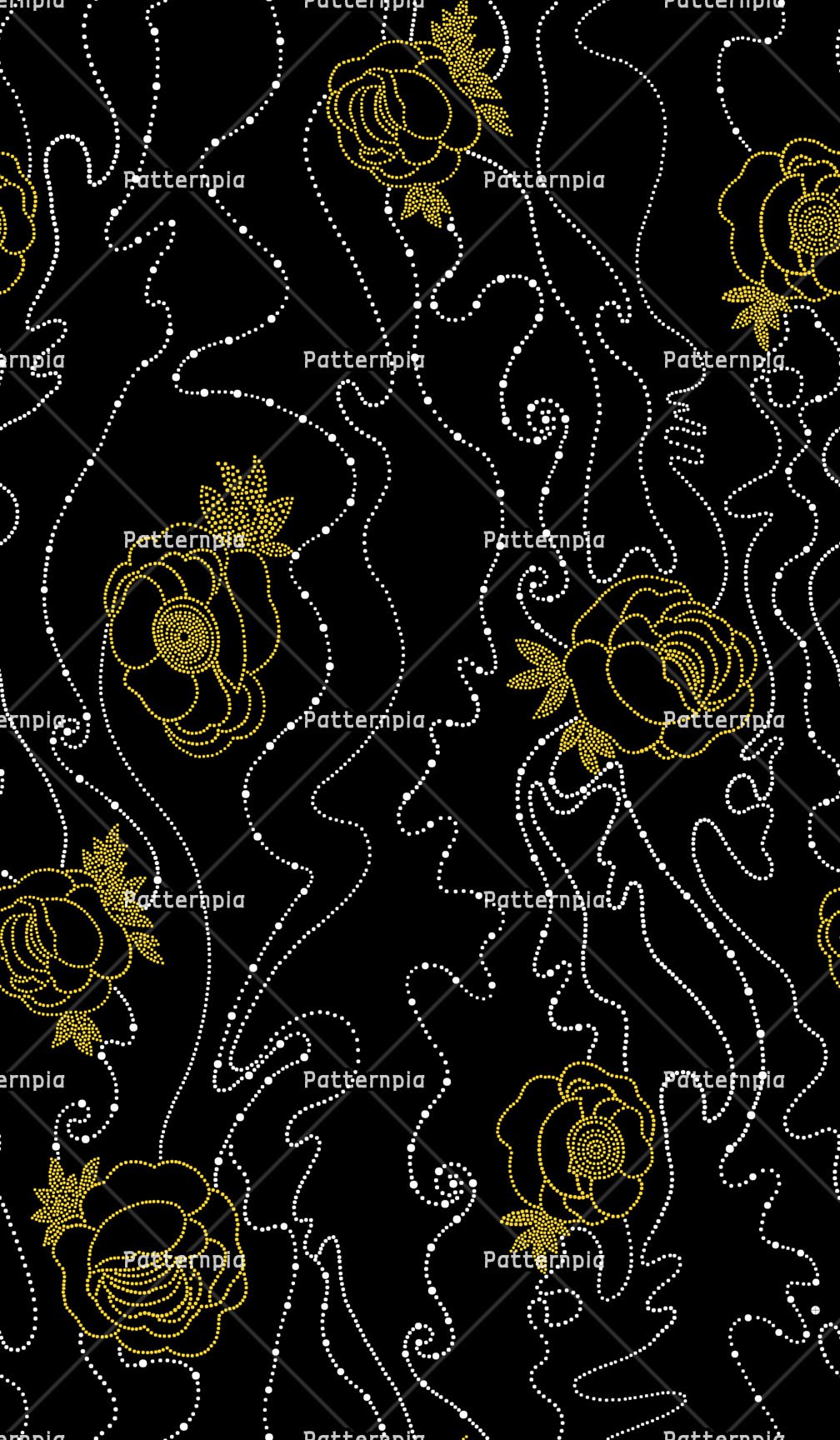 Ethereal dotted roses and flowing stardust trails in gold and white on a solid black ground.