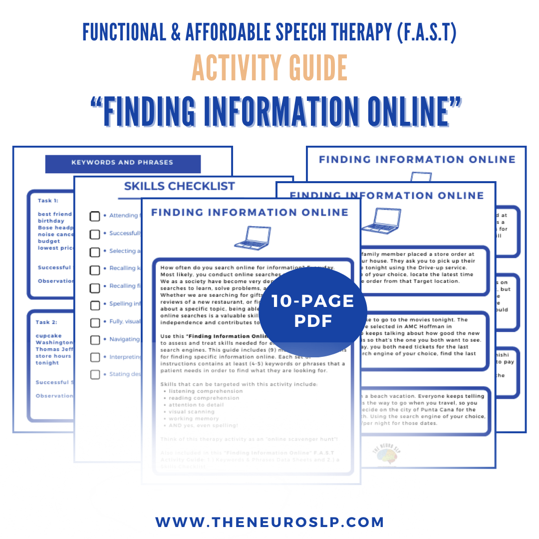 Use this “Finding Information Online” F.A.S.T Activity Guide to assess and treat skills needed for effectively using online search engines. This guide includes (9) multi-step instructions for finding specific information online. Each set of instructions contains at least (4-5) keywords or phrases that a patient needs to find what they are looking for.