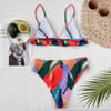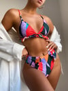 Walk into the summer with this eye-catching, multicolored bikini, accompanied by a flared, triangle top & slightly highwaisted bottoms.