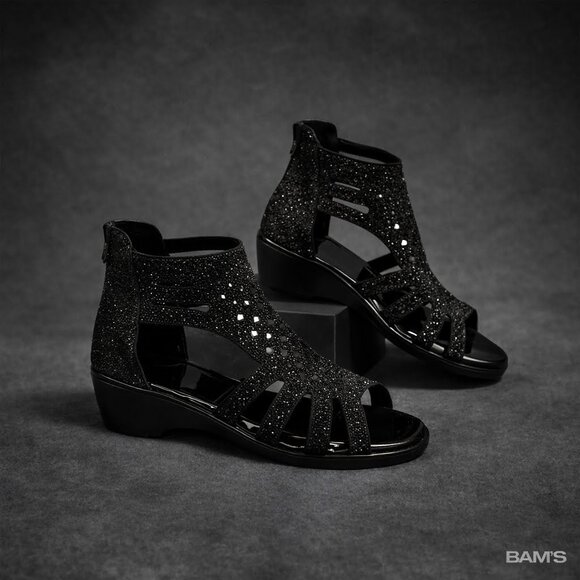 Chic black block heel sandals featuring cutout detailing and subtle rhinestone accents. These are a stylish, comfortable option for dressy casual looks, nights out, or events where you want sparkle without sacrificing stability.