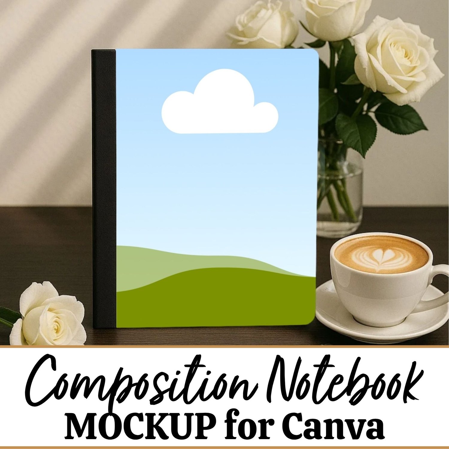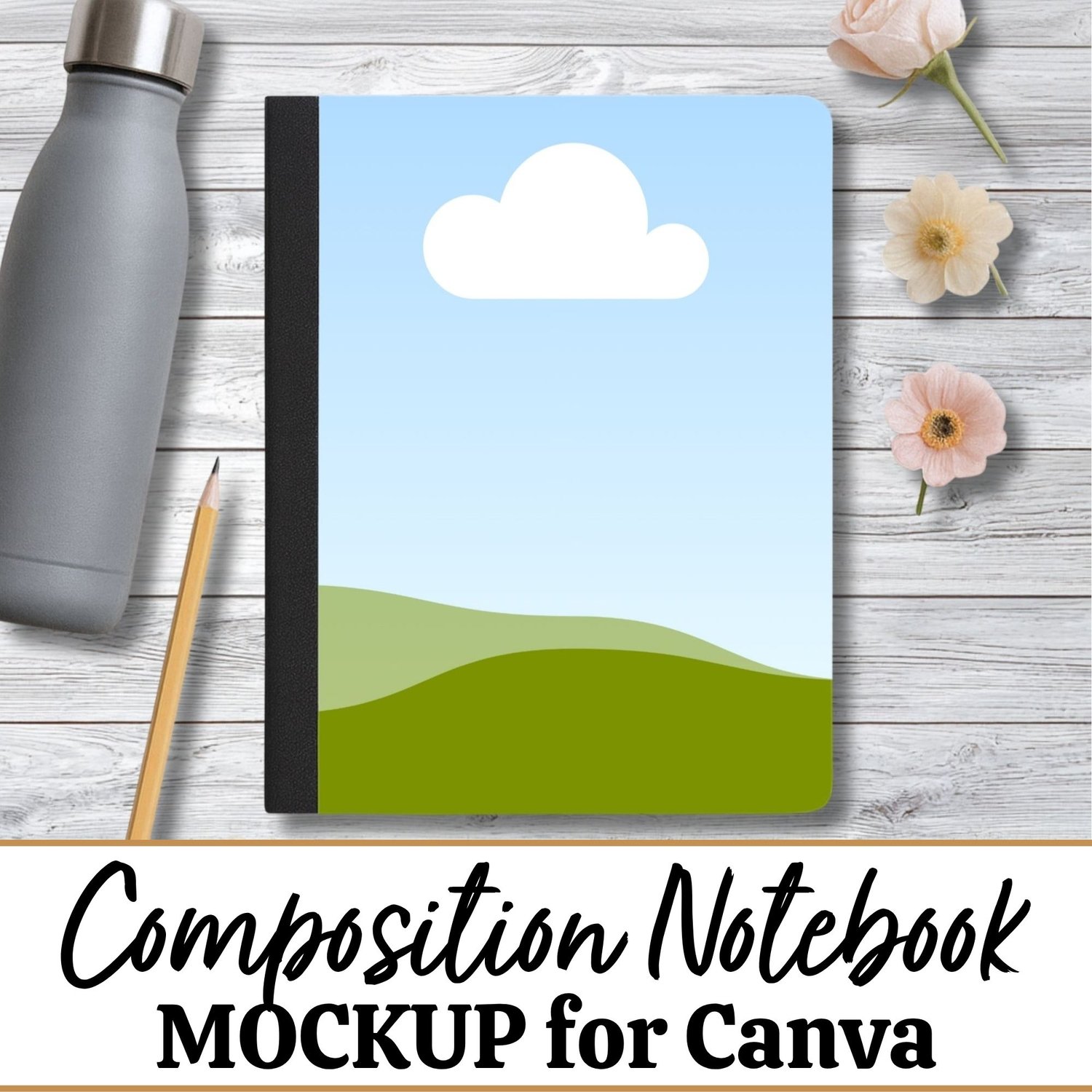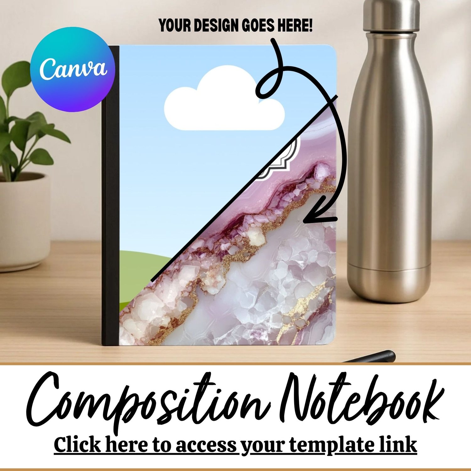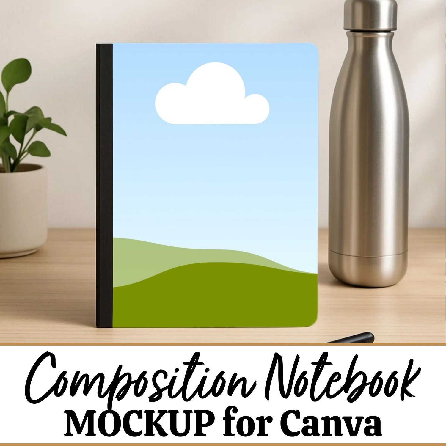 This Composition Notebook Mockup offers a clean, minimal desk setup with soft natural elements like a leafy plant and water bottle in the background. Made for Canva, it’s simple to drop in your design and create polished, scroll-stopping listing photos.