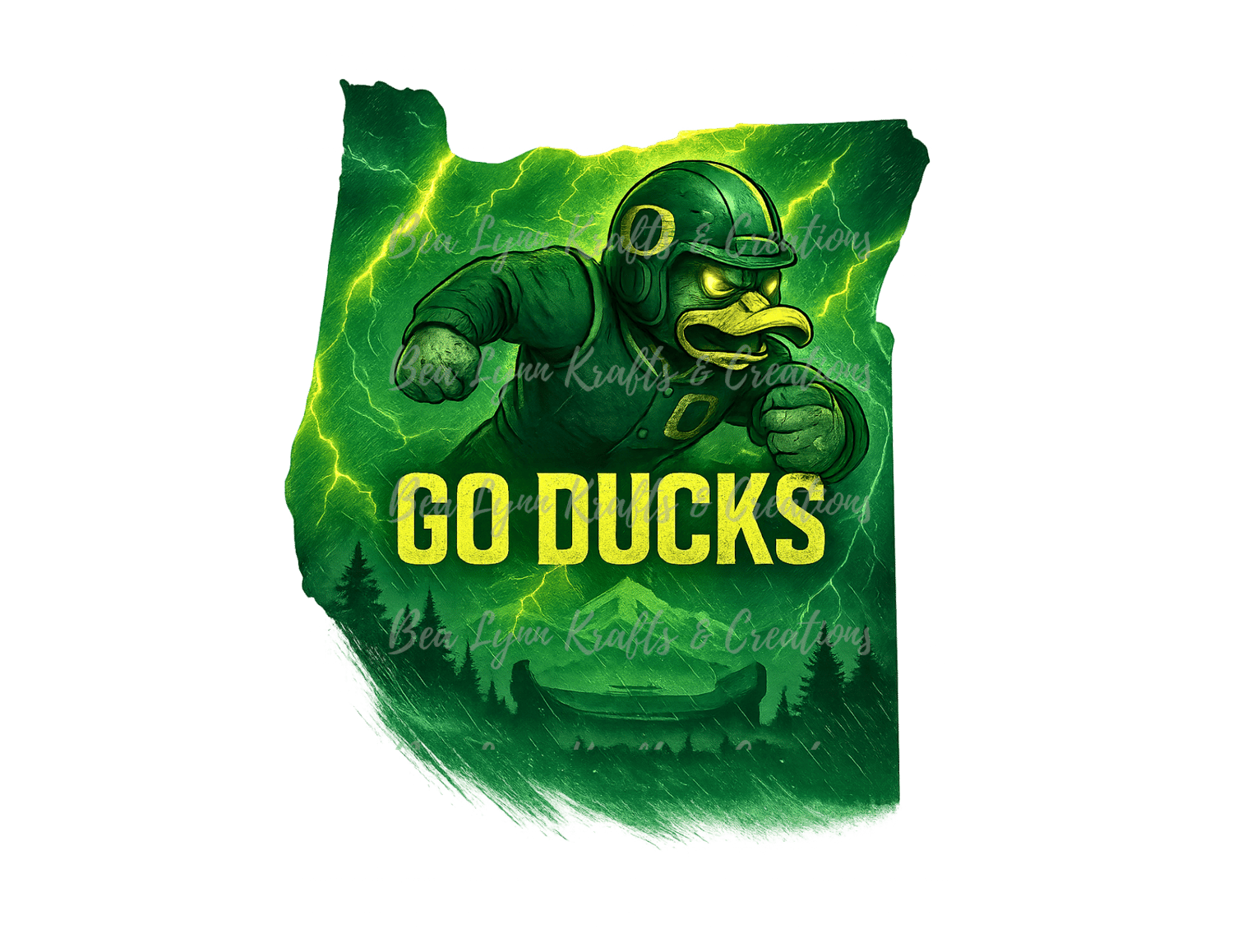 - Bold “OREGON” or “GO DUCKS” text in college block font