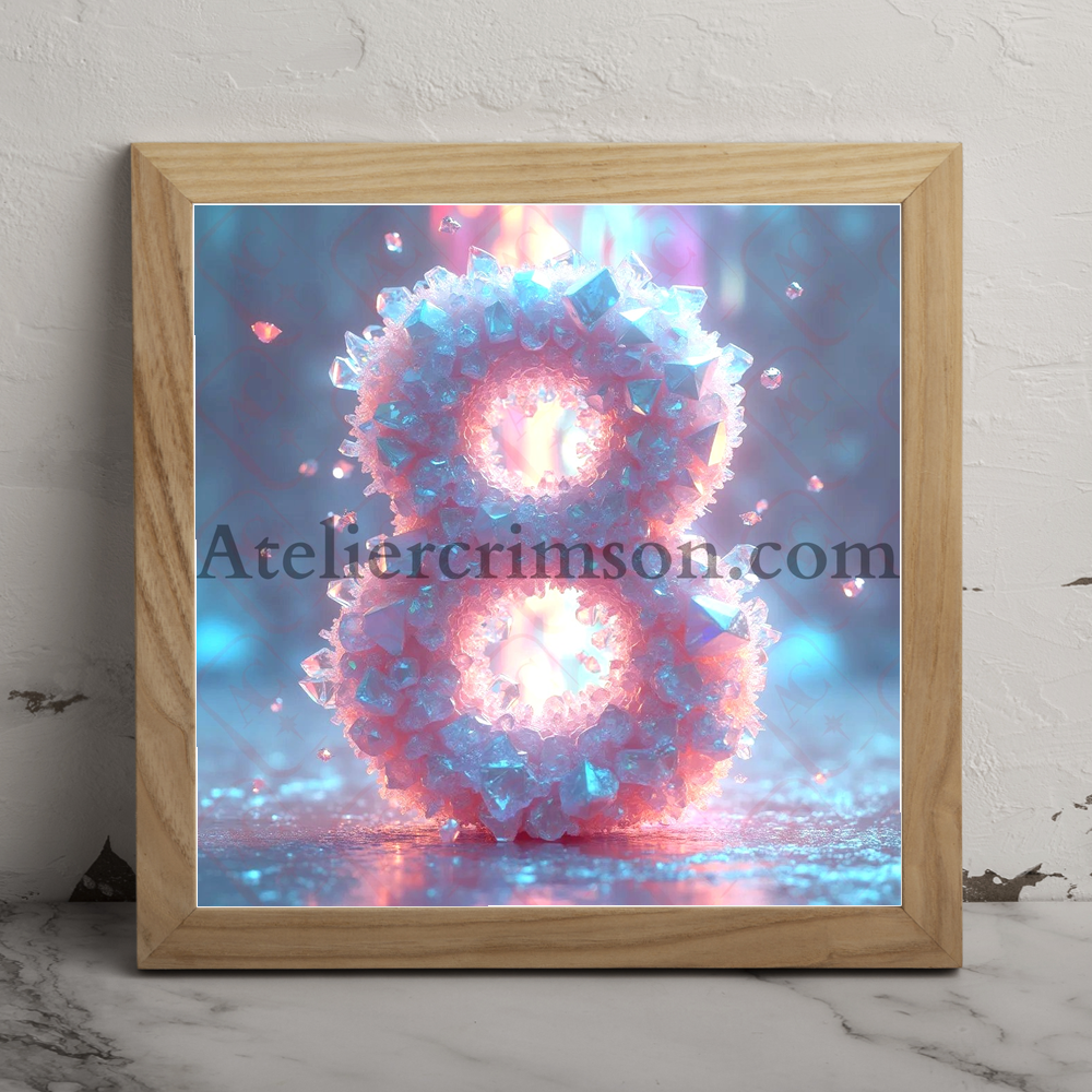 Number 8 crystalline Retro Futuristic C A unique creation blending retro-futuristic aesthetics and geometric elegance. Each character is sculpted from iridescent crystals in vibrant, nostalgic hues, set in delicate silver filigree. Against a gradient background transitioning from deep purple to teal blue, this digital artwork captures the essence of 80s-inspired digital art with a touch of crystalline luxury. Perfect for typography enthusiasts, digital art lovers, and those who appreciate retro-futuristic aesthetics.
