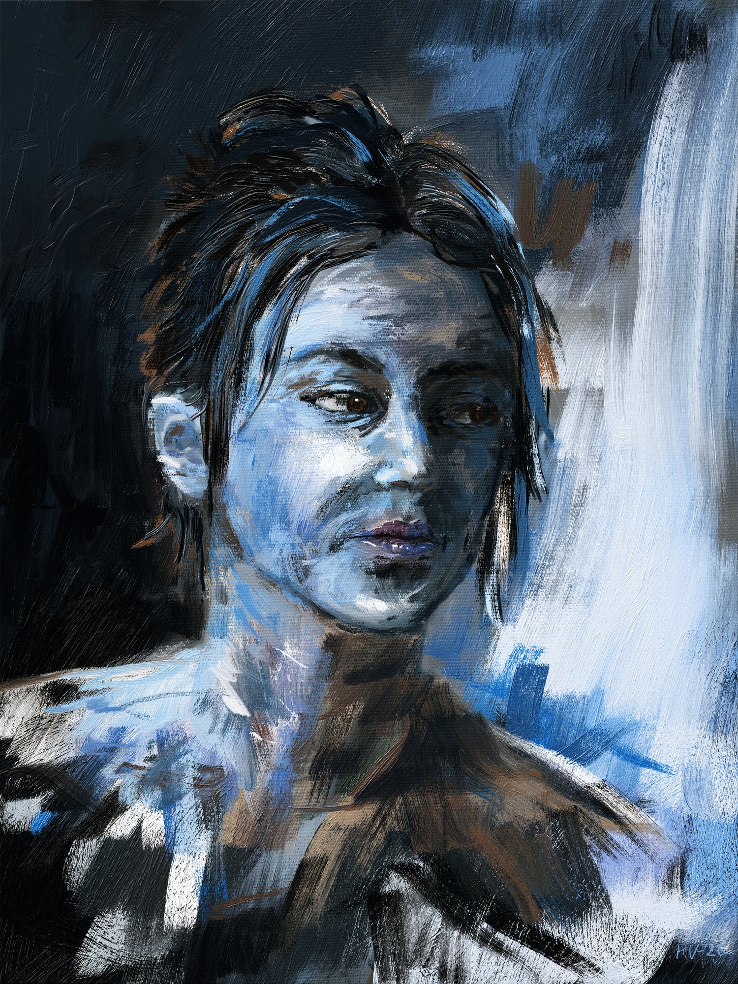 Blue Gaze Beyond – Bring charm into your space with this digital portrait painting. Hand-painted in a rich oil‑paint style, this artwork adds character and a timeless artistic touch to any room.