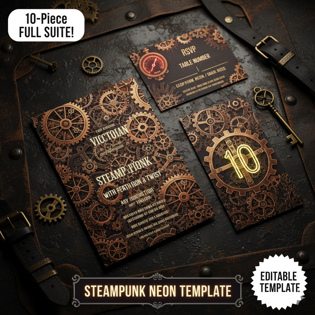 UNIQUE Steampunk Twist 10-Piece Neon Wedding Suite | Victorian Glow Theme | Editable Template