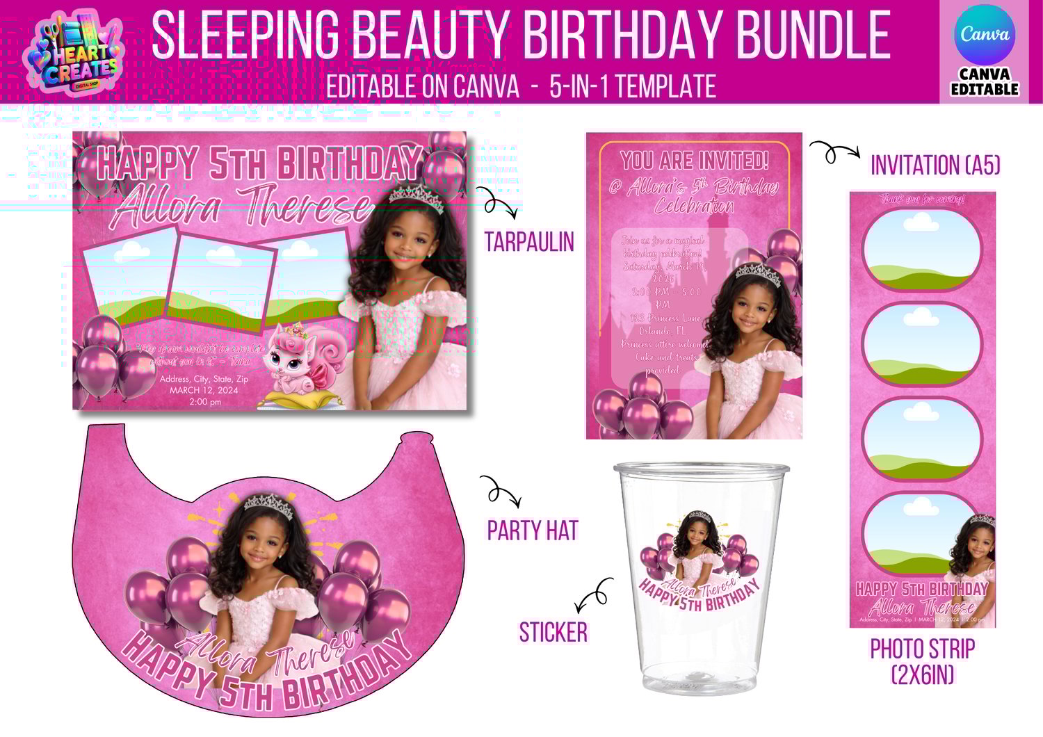 Perfect for Sleeping Beauty–themed birthdays, this bundle allows you to personalize with your child’s name, age, photo, and party details directly in Canva — no design experience needed!