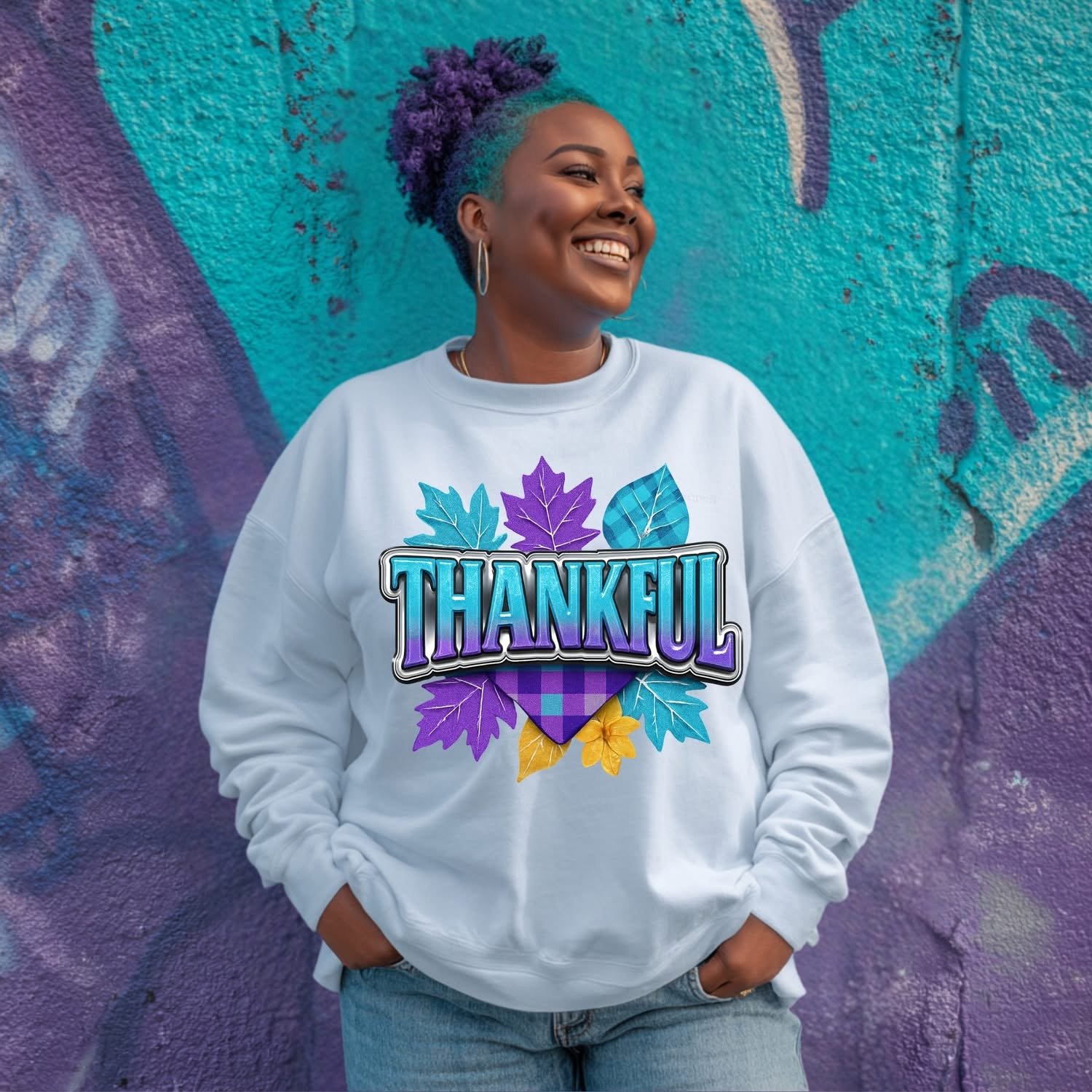 Celebrate the season of gratitude in style with this cozy “Thankful” Fall Sweatshirt — featuring bold purple, teal, and gold autumn leaves wrapped around a buffalo plaid heart. Designed for comfort and confidence, this crewneck is perfect for Thanksgiving gatherings, cozy weekends, or simply reminding yourself to stay grateful all season long.