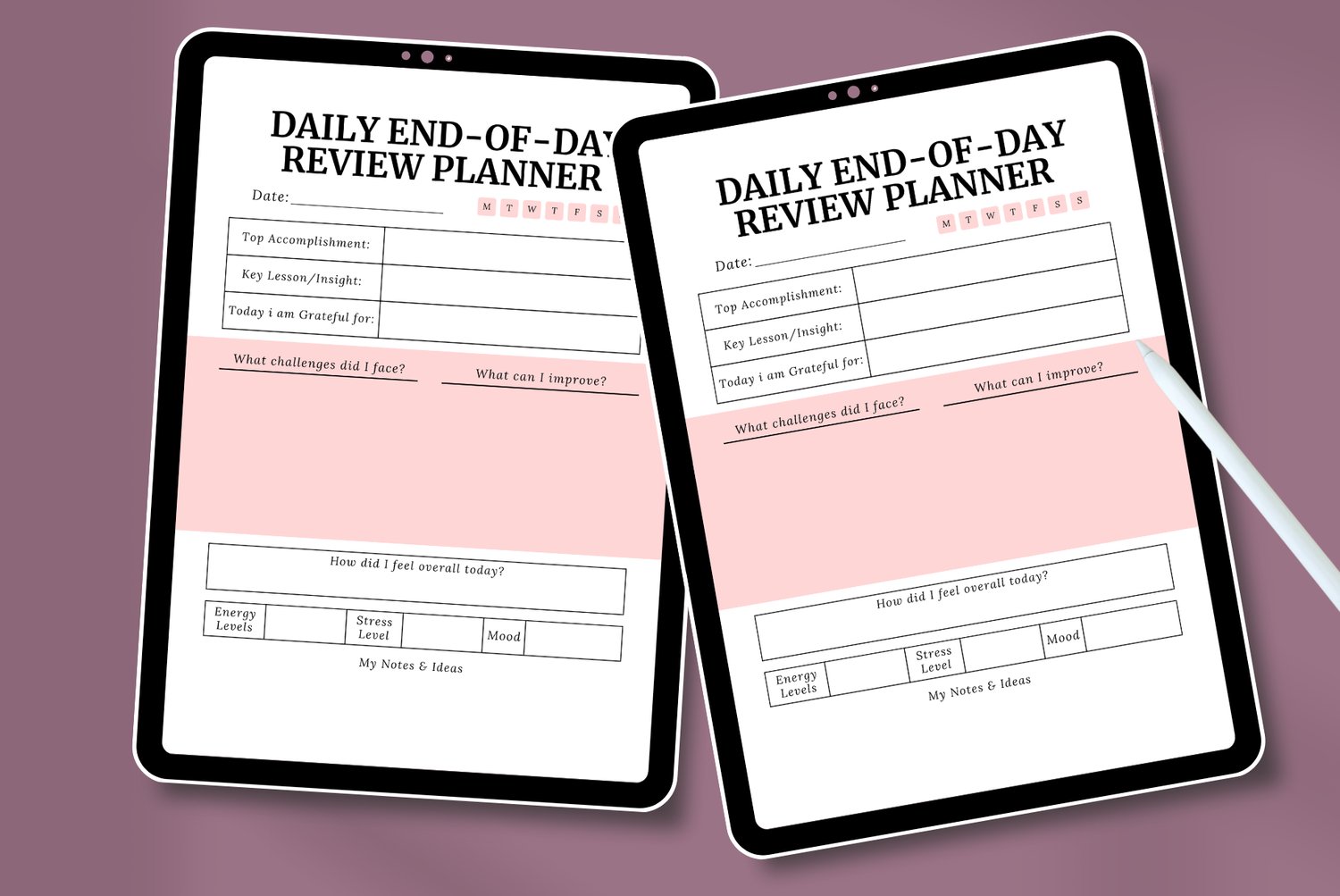 Transform your day with intentional closure using this Daily End-of-Day Review Planner. This printable template is designed to foster self-awareness, celebrate wins, learn from challenges, and build positive habits through daily reflection. Perfect for anyone serious about personal growth, mindfulness, and ending each day on a high note.