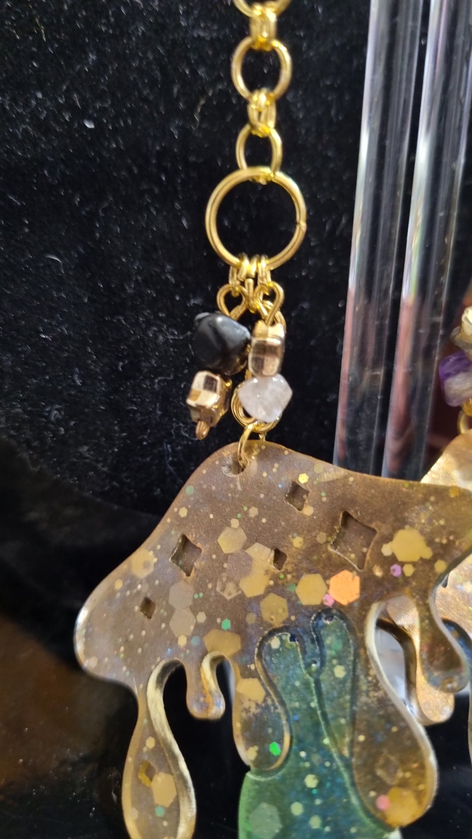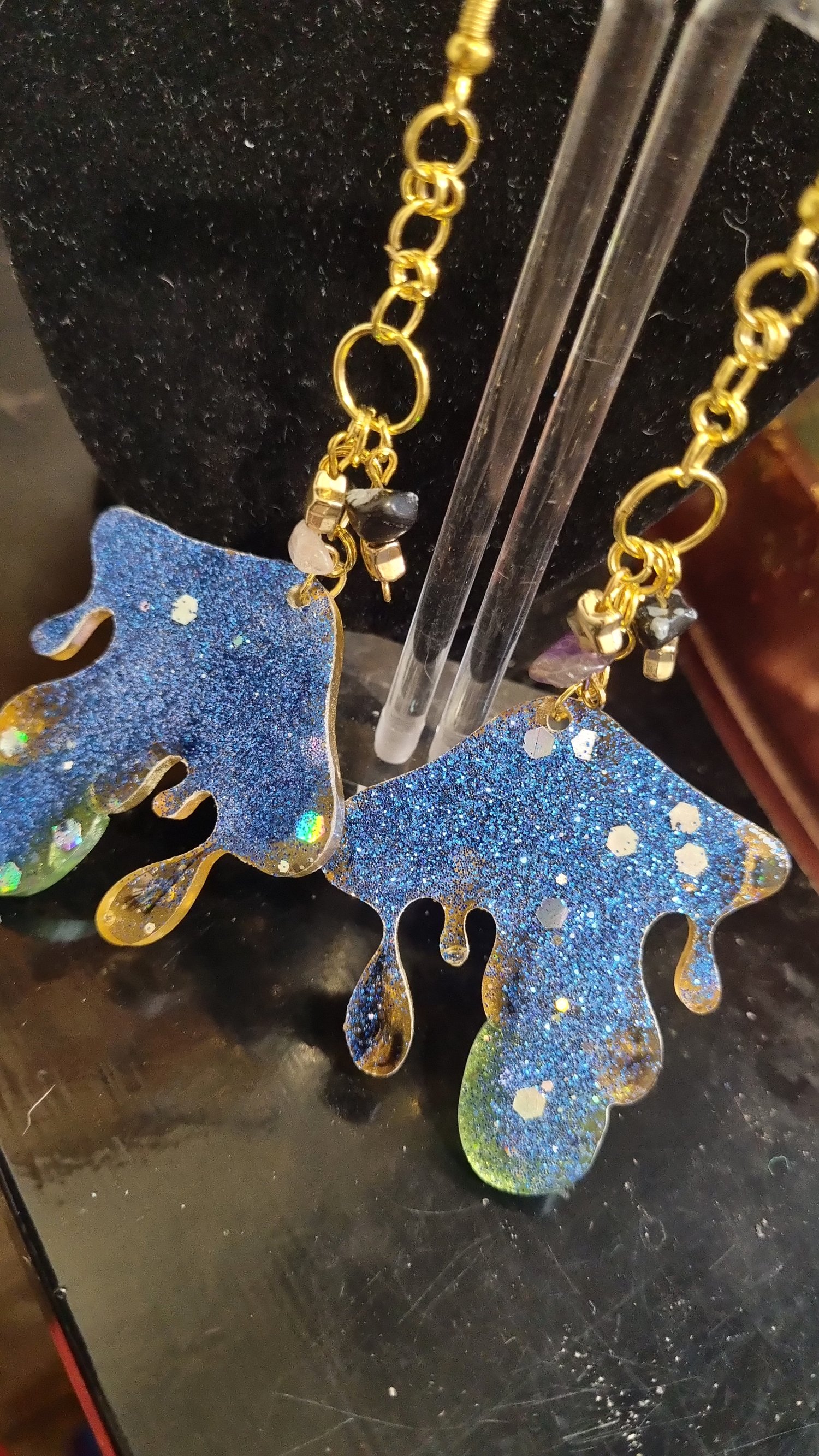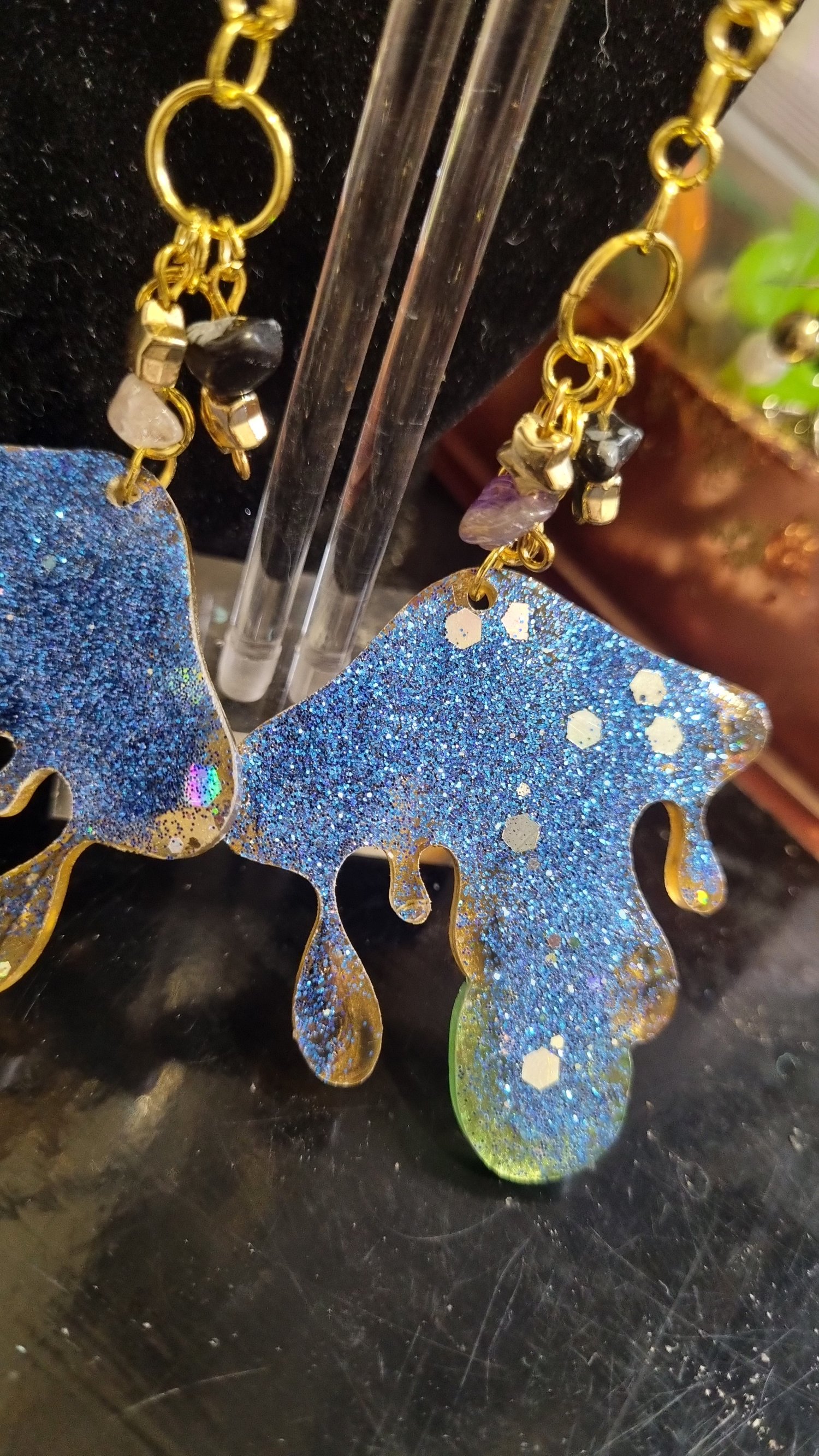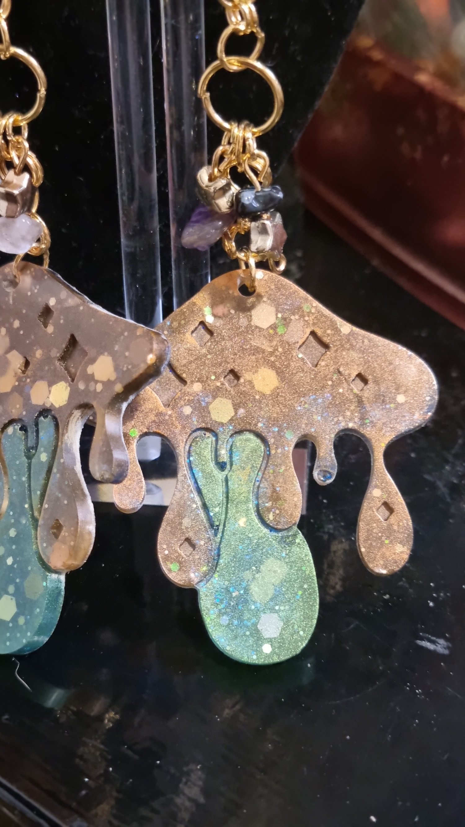 π Bronze + green resin mushrooms β rich, earthy tones on the front with a cascade of shimmering blue glitter on the back, bringing depth and magic from every angle.