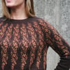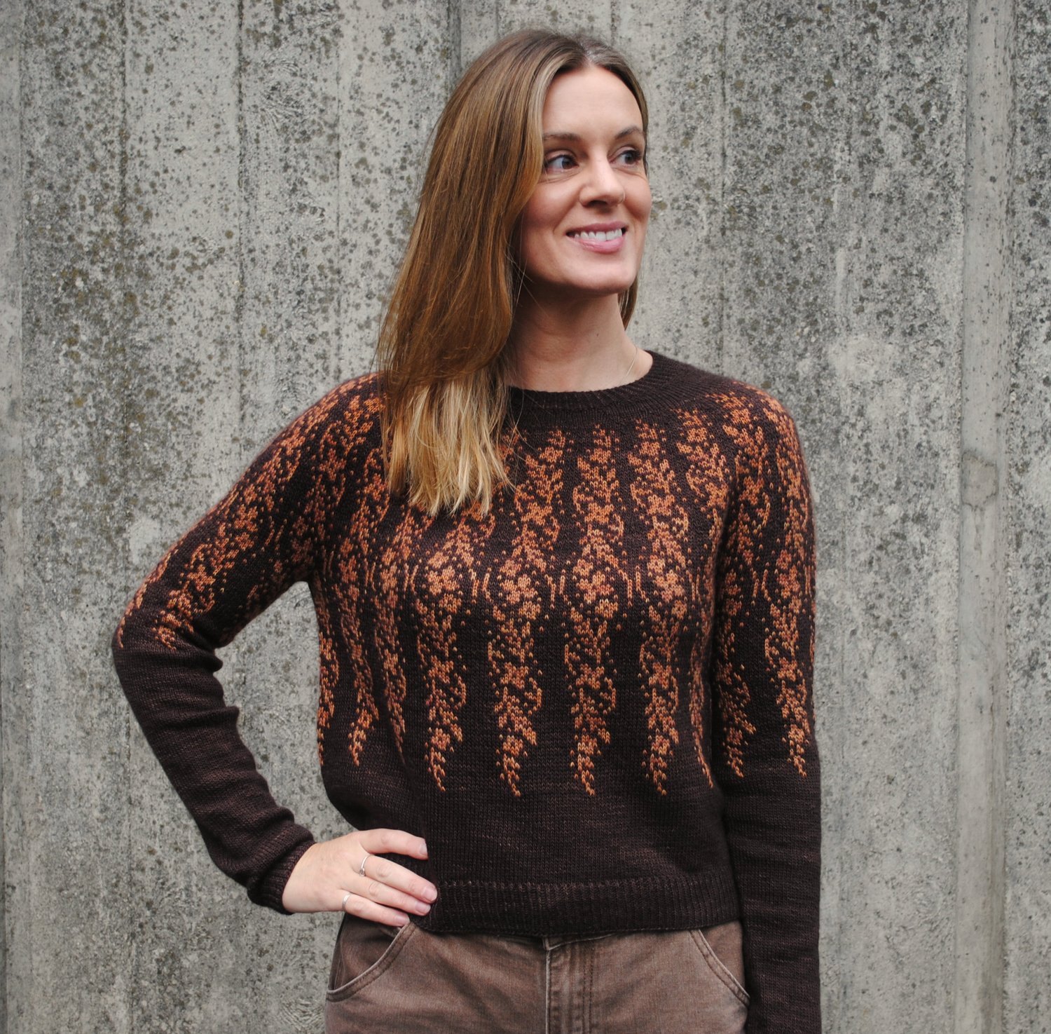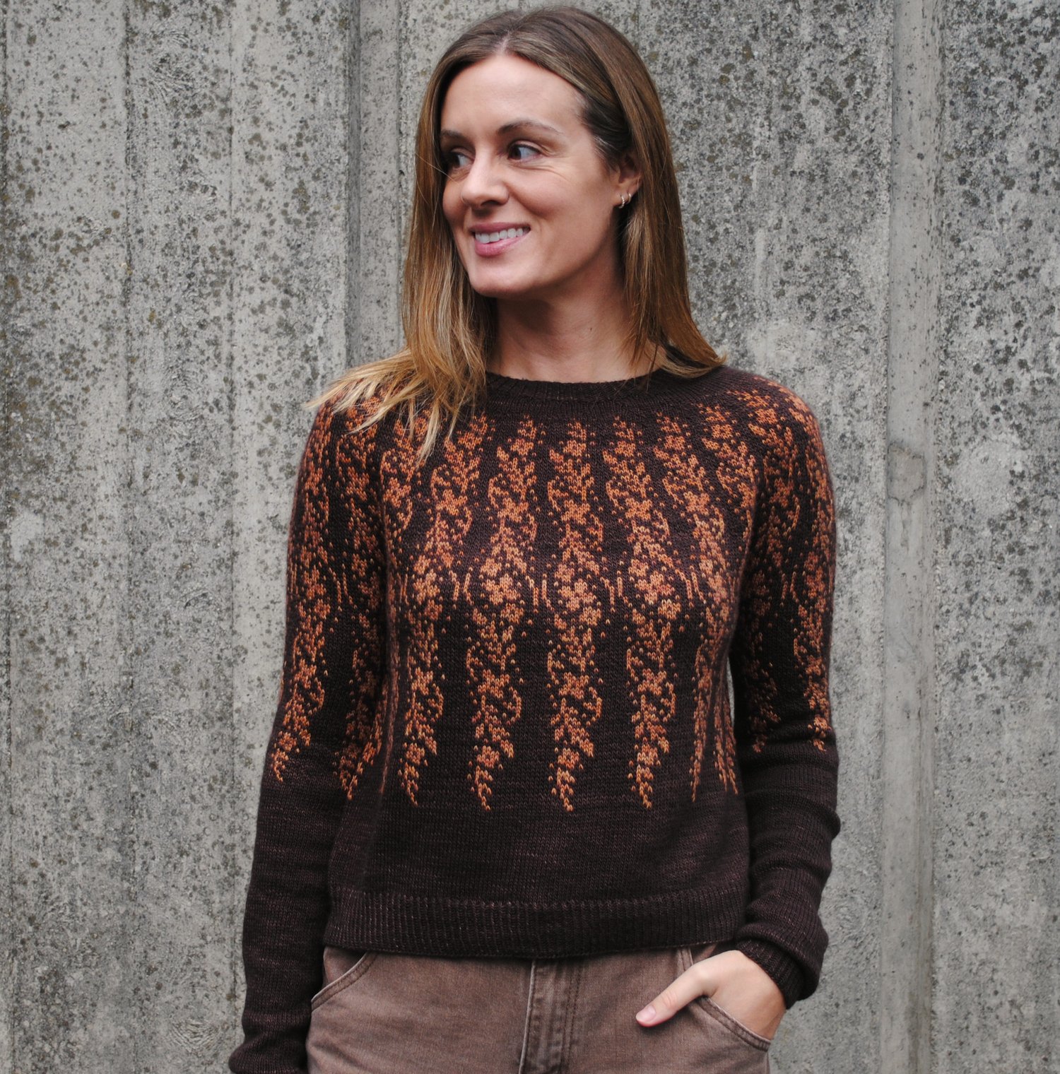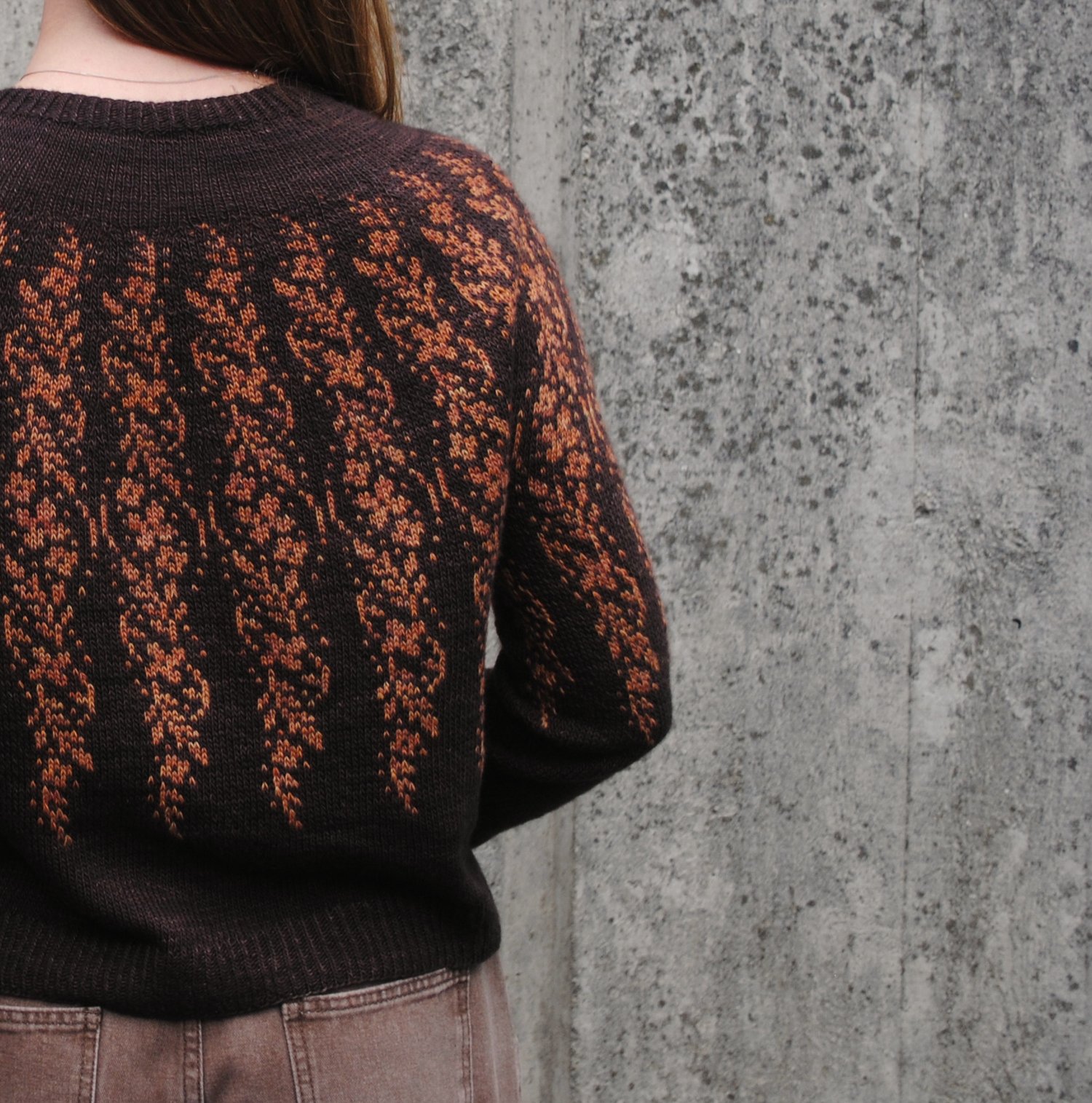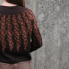 Henna is a top-down, colourwork yoked sweater. The stranded colourwork pattern is inspired by henna tattoo art. In the summer I attended a festival and received a beautiful henna tattoo featuring vines, leaves and swirls; this is my knitted interpretation of that art.