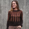 This garment is worked top-down, in the round. After the neckband, short row shaping is incorporated to optimise fit. The majority of the yoke features a stranded colourwork pattern. Once the yoke is completed, stitches are separated into body and sleeves, which are each worked separately and in the round. The stranded colourwork pattern continues into the upper body and sleeves, after which the remainder of each is worked in stockinette in the round. Twisted ribbing is worked to form the waistband and cuffs.