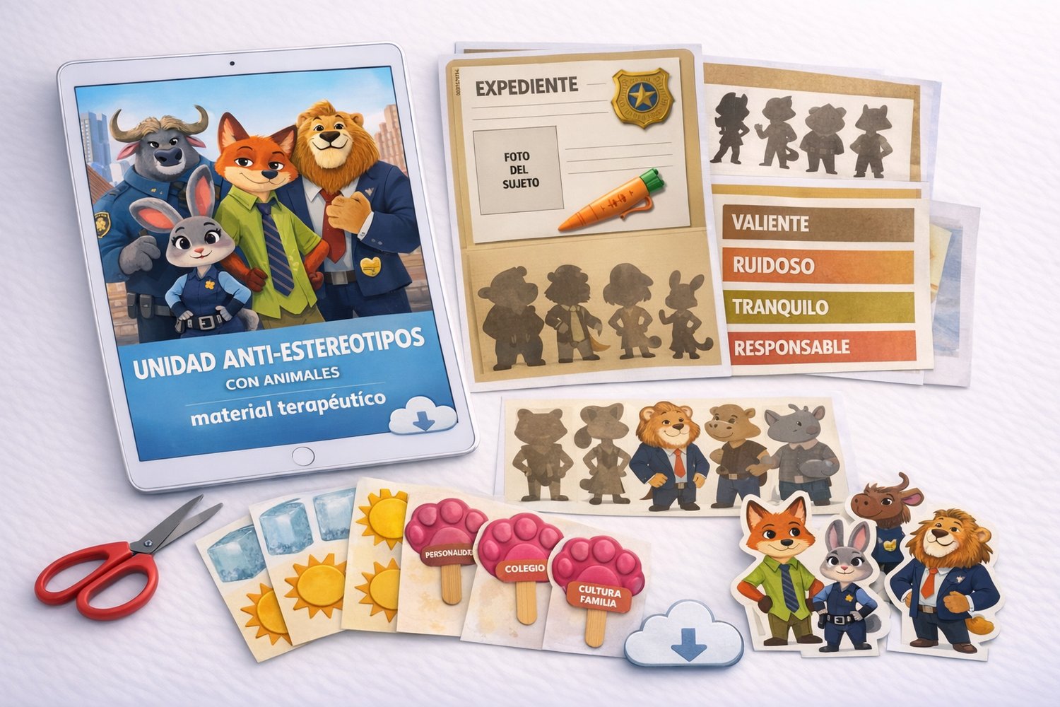 (Foto referencial: en Instagram @Tupsicologavilu en las historias desacatadas podrás encontrar en “recursos” todos los materiales) Este material terapéutico está diseñado para trabajar estereotipos, etiquetas y prejuicios en niños y niñas de forma lúdica, reflexiva y respetuosa. Inspirado en el universo de Zootopia, propone actividades concretas que ayudan a diferenciar suposiciones de hechos, cuestionar ideas rígidas y ampliar la forma en que los niños se miran a sí mismos y a los demás.