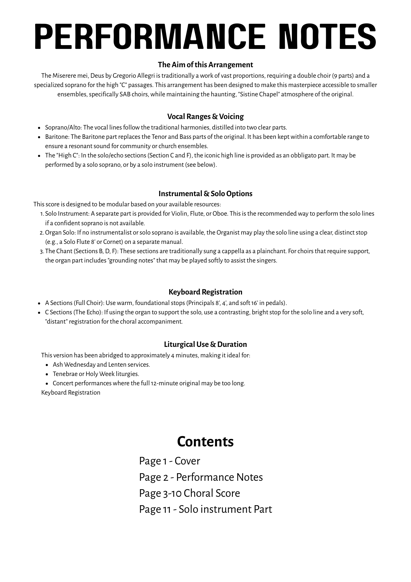 For many small church choirs, Allegri’s Miserere is off-limits because of the demanding Soprano range. This setting maintains the spiritual gravity of the original while providing a modular approach to the famous "High C" sections.