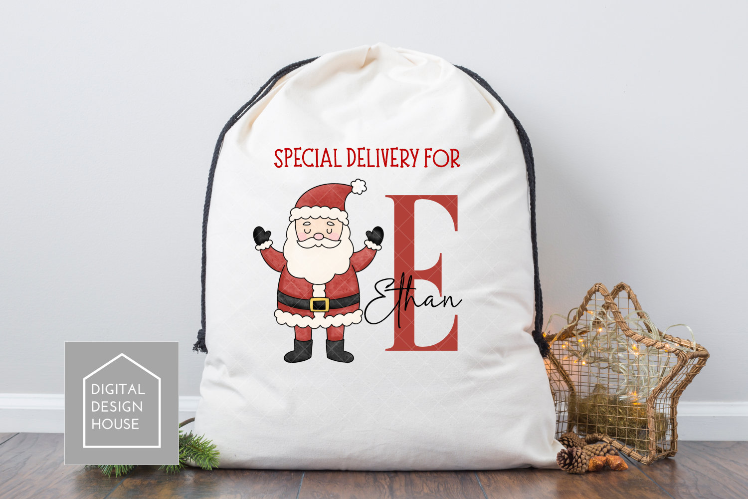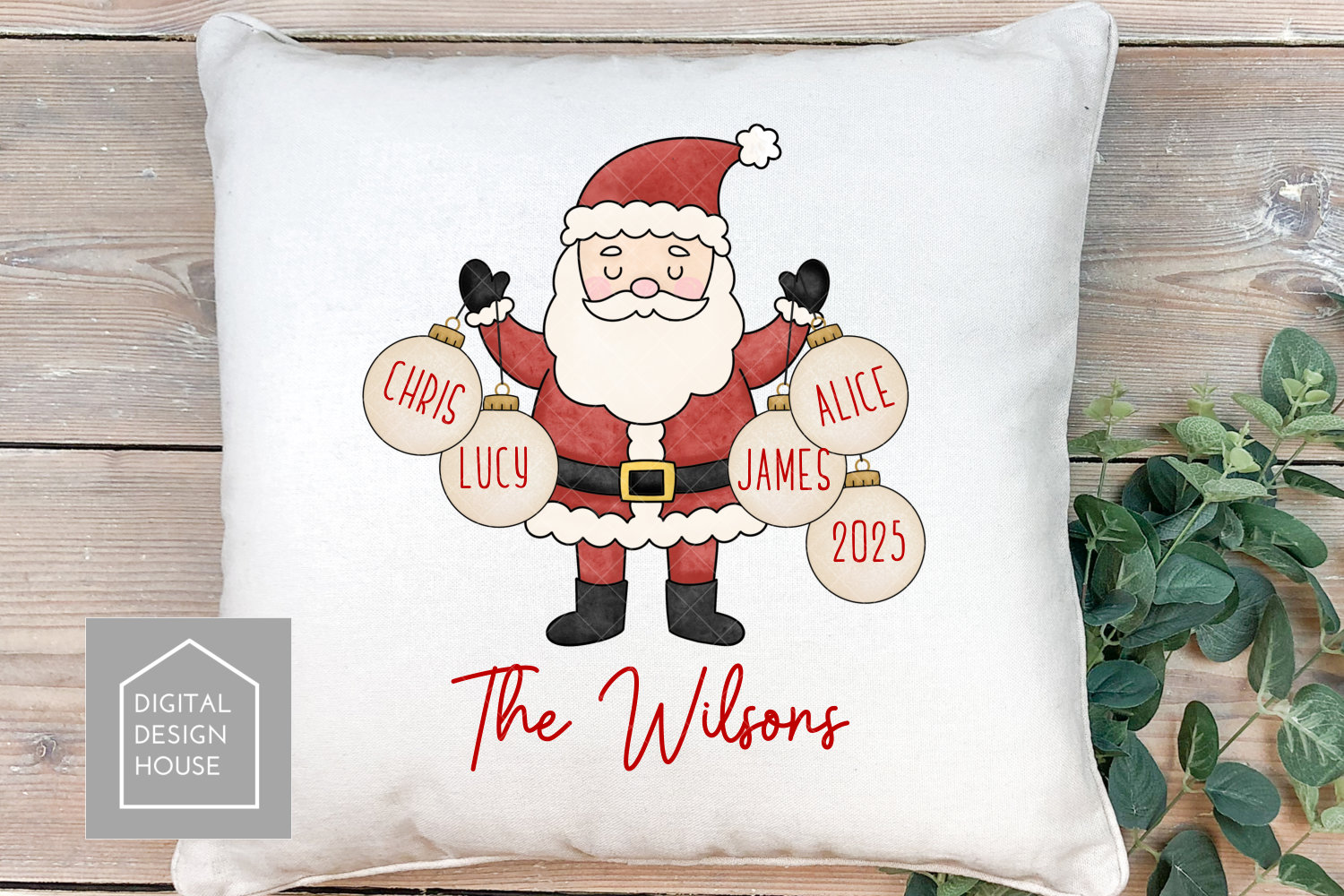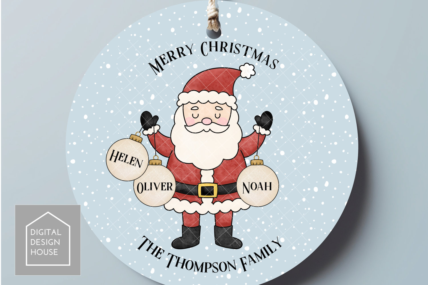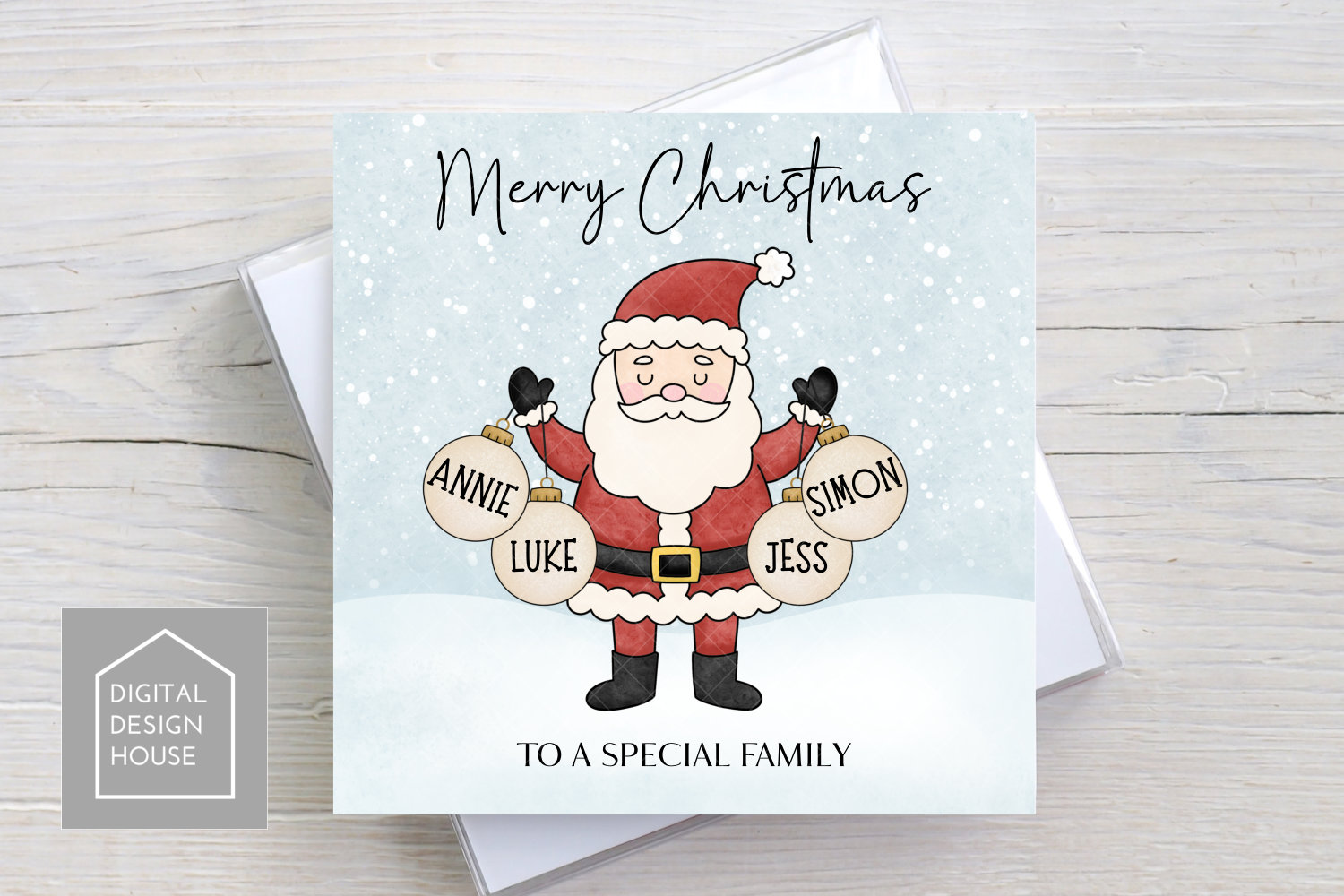 Perfect for Christmas ornaments, cards, mugs, and wall art — this festive set features Santa holding baubles you can customise with family names or messages. Comes with ready-made Santas holding 1 to 8 baubles, plus a matching snowy background for easy designs.