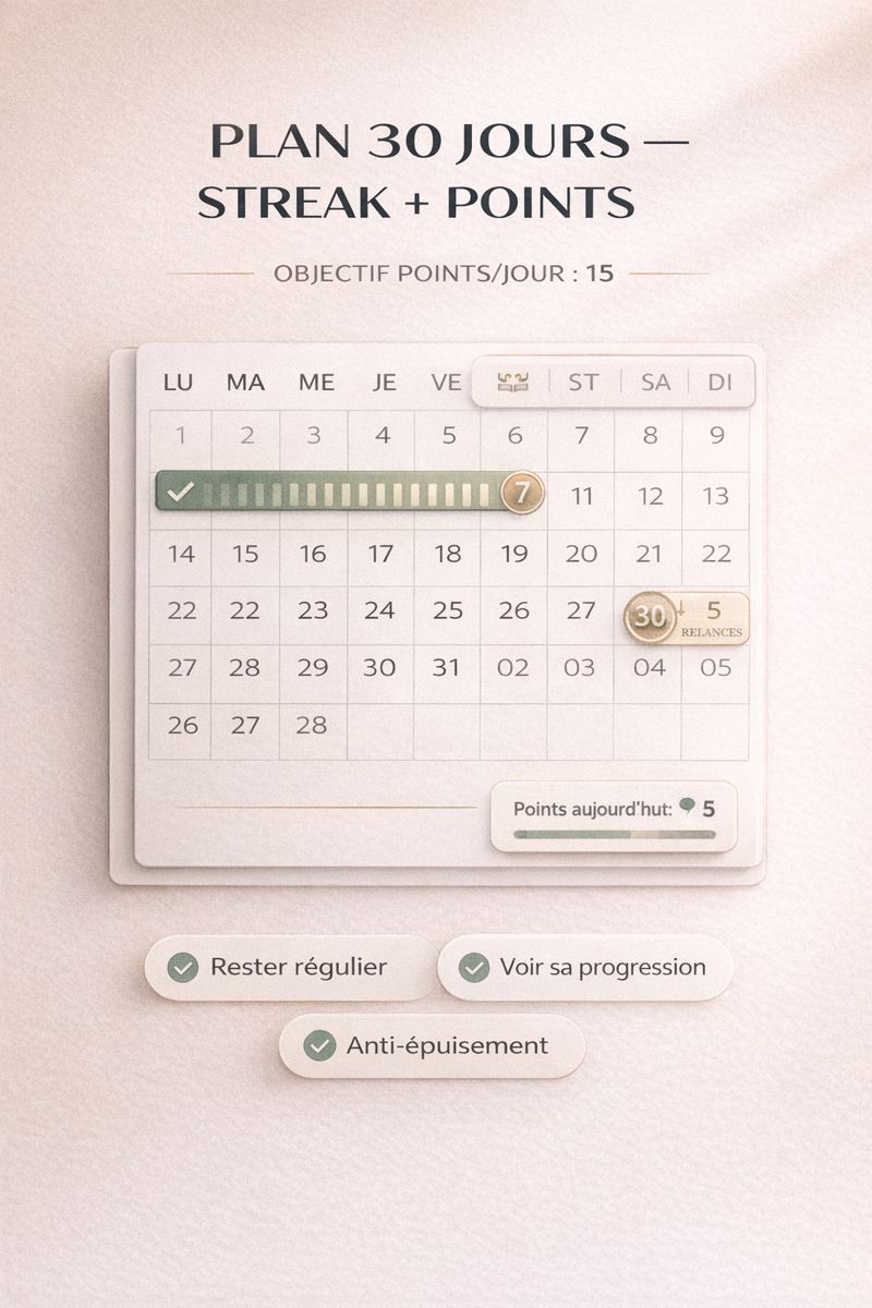 - Streak 30 jours / système de points (pour tenir sans pression)