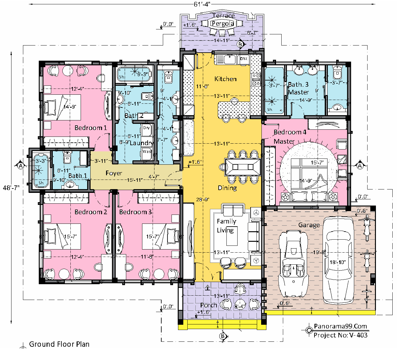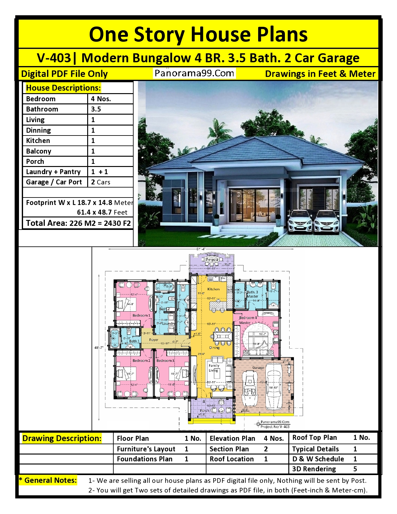V-403| Modern Bungalow Floor Plans – 4 Bedroom One-Story House with Garage