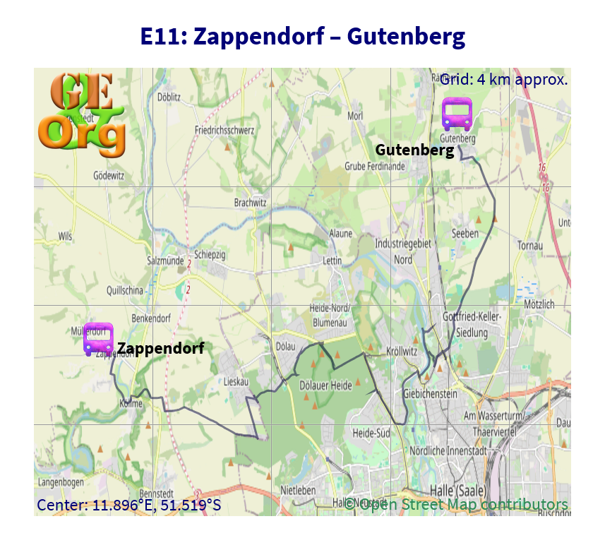 European Long Distance Hiking Path E11, Zappendorf to Gutenberg, one GPX file,GeoJSON file, one OpenStreetMap image.
