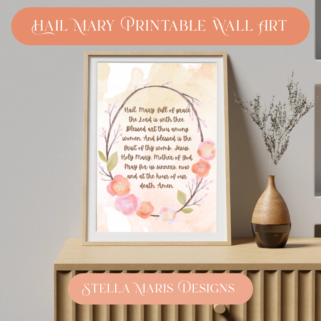 Bring peace and beauty to your prayer space with this elegant Hail Mary printable wall art. Featuring the beloved Catholic prayer encircled by a delicate watercolor floral wreath, this design blends devotion and artistry in a soft, serene palette. The gentle beige-pink watercolor background adds warmth and grace, making it perfect for home altars, nursery blessings, or Marian feast day décor.