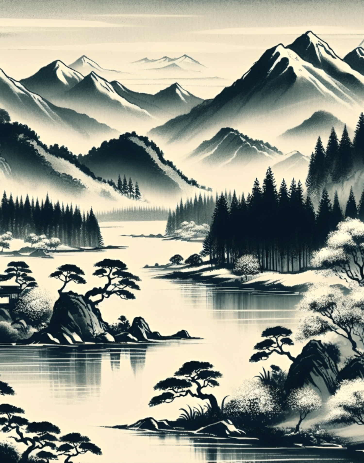 Japanese Ink Style Painting, River, Mountain, Vintage Village, Top Art, Nostalgic Rural life, Nature, Cool Nature, Beautiful Nature, Natural Landscape, Wall Art, Digital Art.