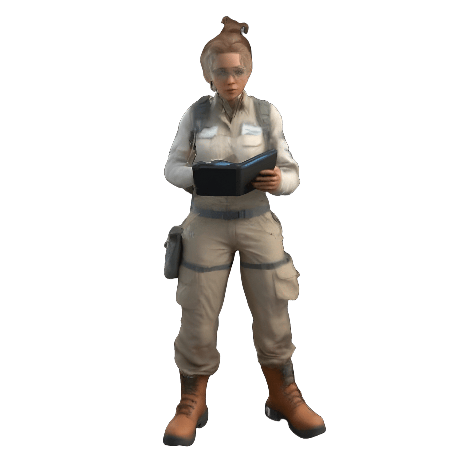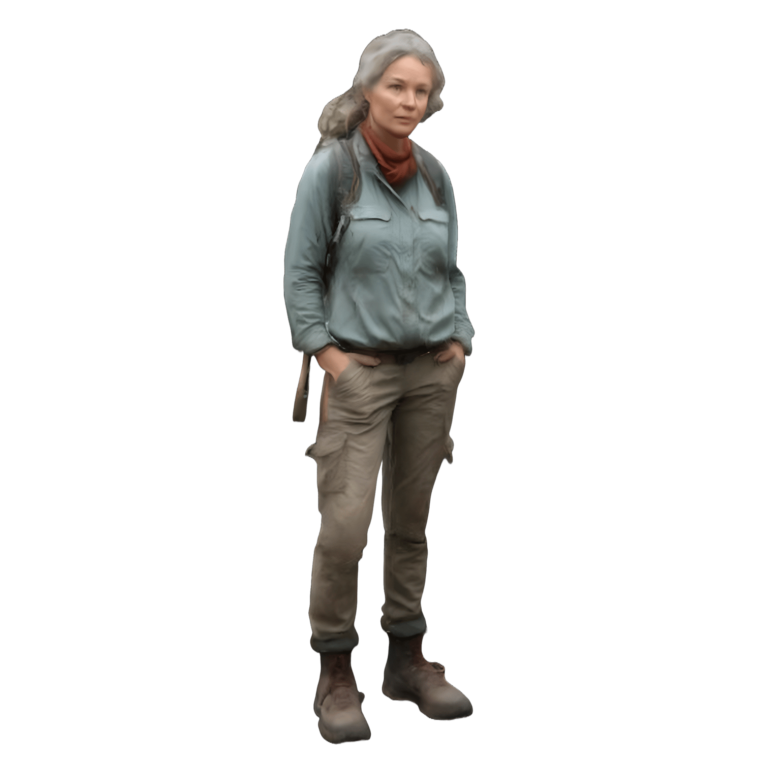 - A mature outdoor/field researcher in practical wear with a red scarf