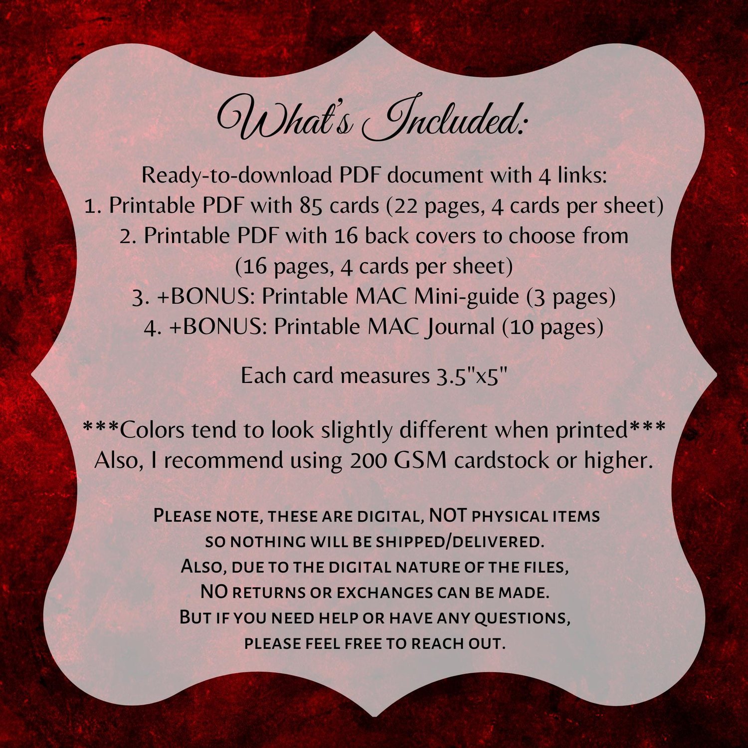 Available in size 3.5"x5", the deck also includes 16 back cover designs, a BONUS Printable Guide to Using MAC Cards, and a BONUS Printable MAC Journal.