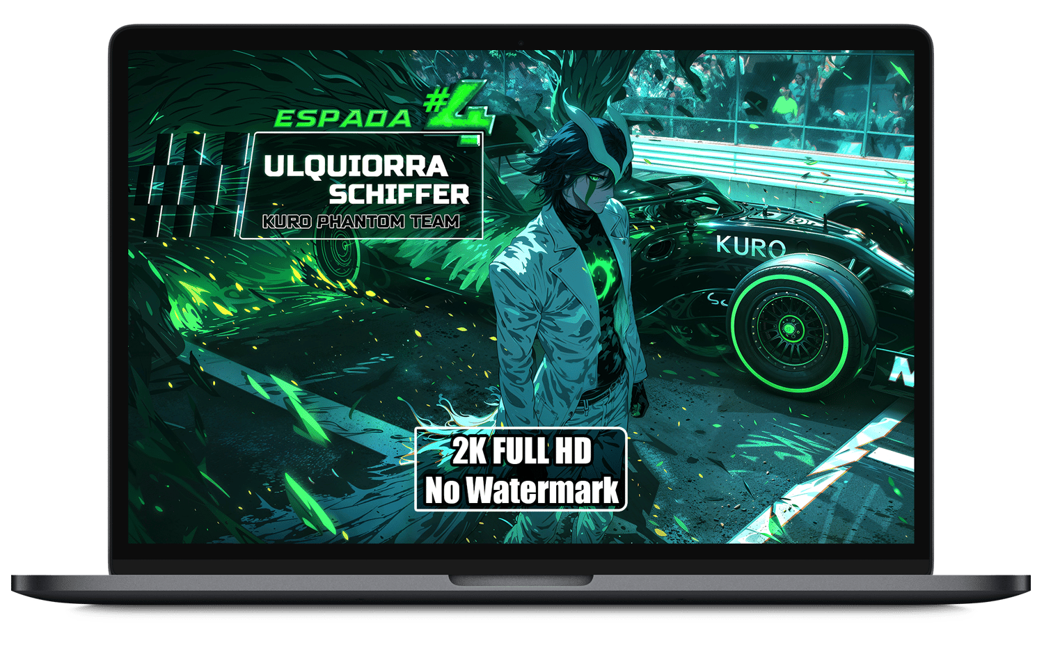 Immerse yourself in a stark race day scene as Ulquiorra stands amid an F1 pit lane soaked in shadows. His emotionless gaze and Arrancar armour contrast with the sleek aerodynamics of a championship car, capturing a dramatic crossover between Bleach and motorsport.