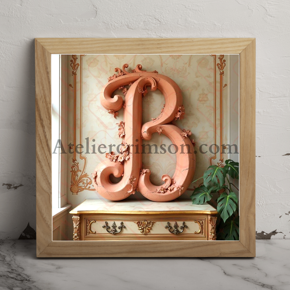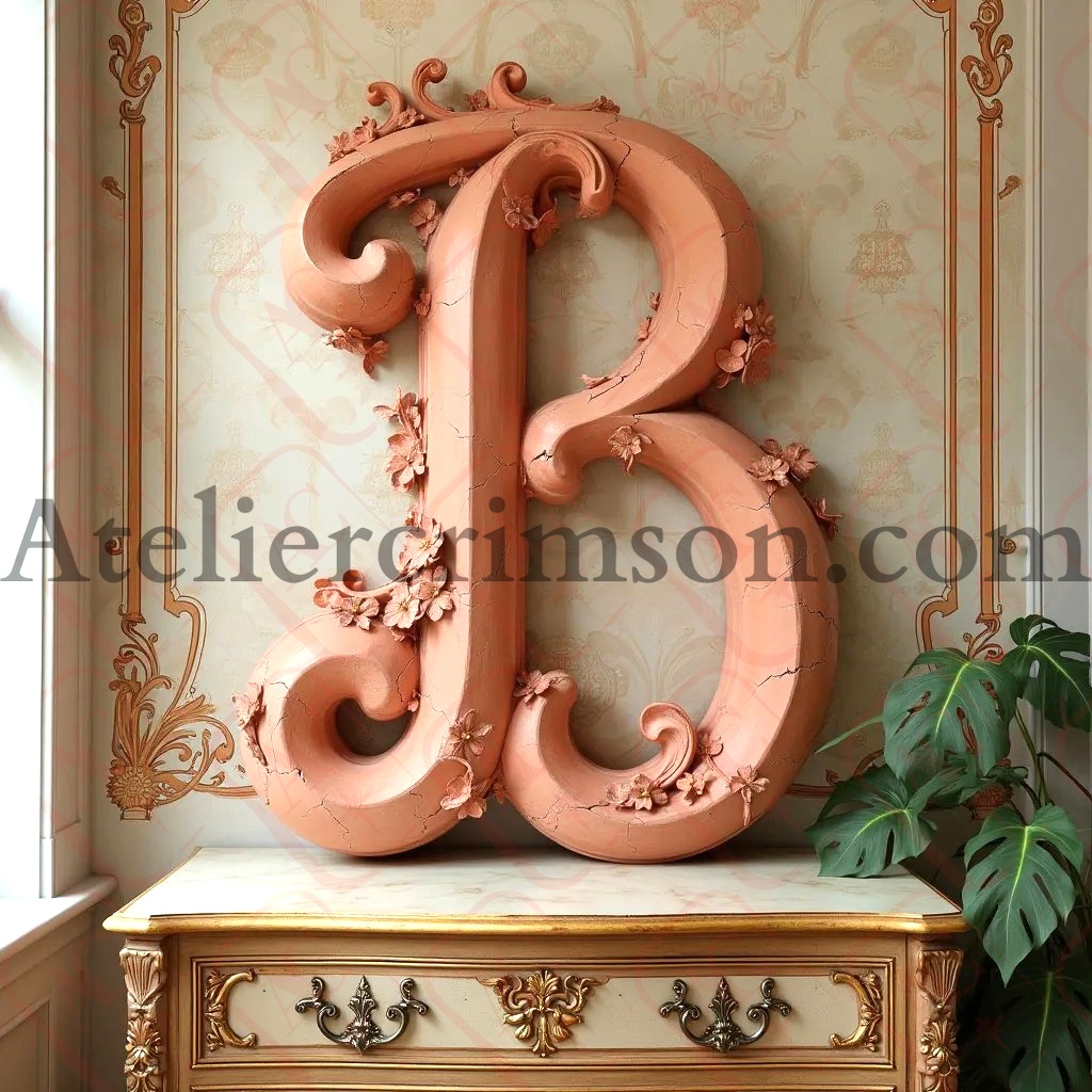 The letter B terracotta Art Nouveau typeface inspired by Alphonse Mucha's with flowing lines and floral motifs, set against a soft, muted background with a gilded wooden dresser and subtle lighting effects.