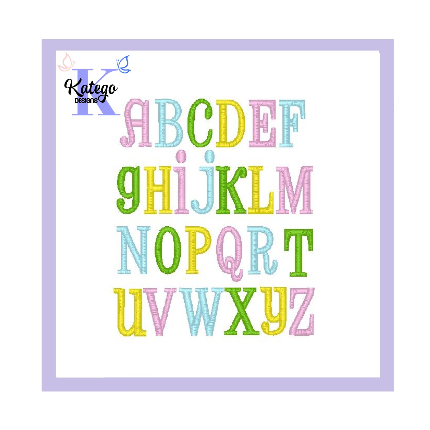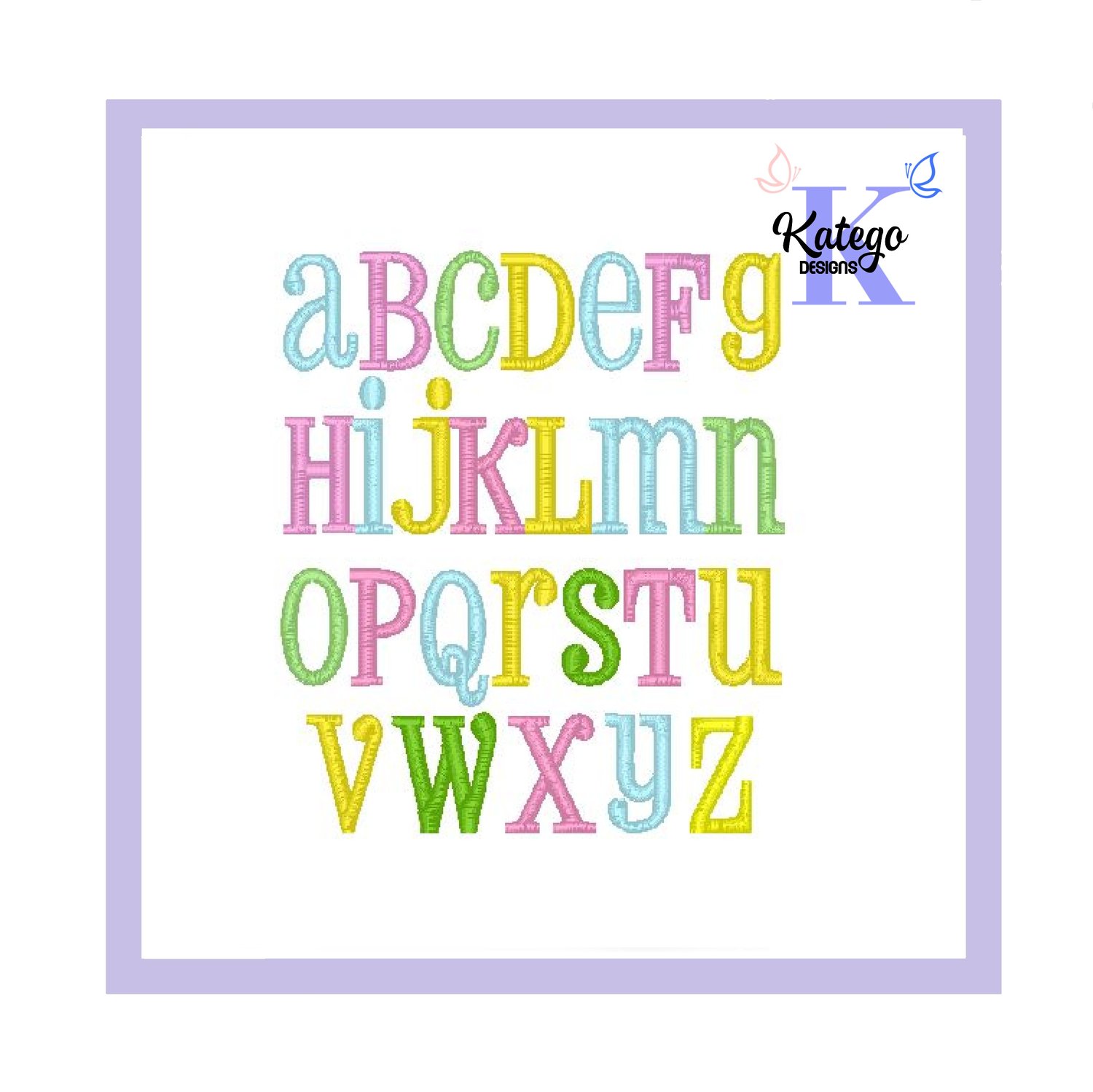 Each size included: A-Z upper- and lower-case letters. All sizes are SATIN stitch.