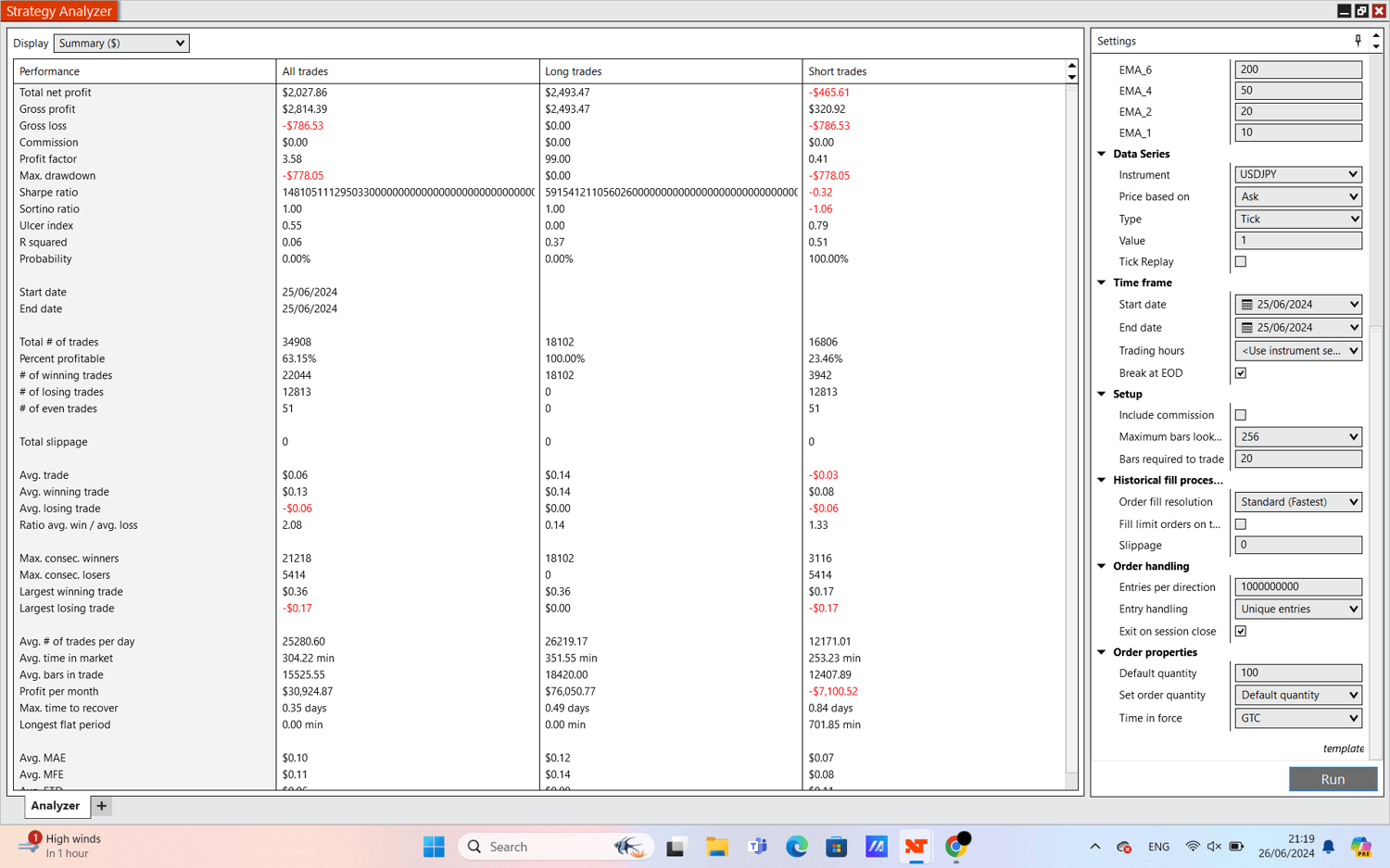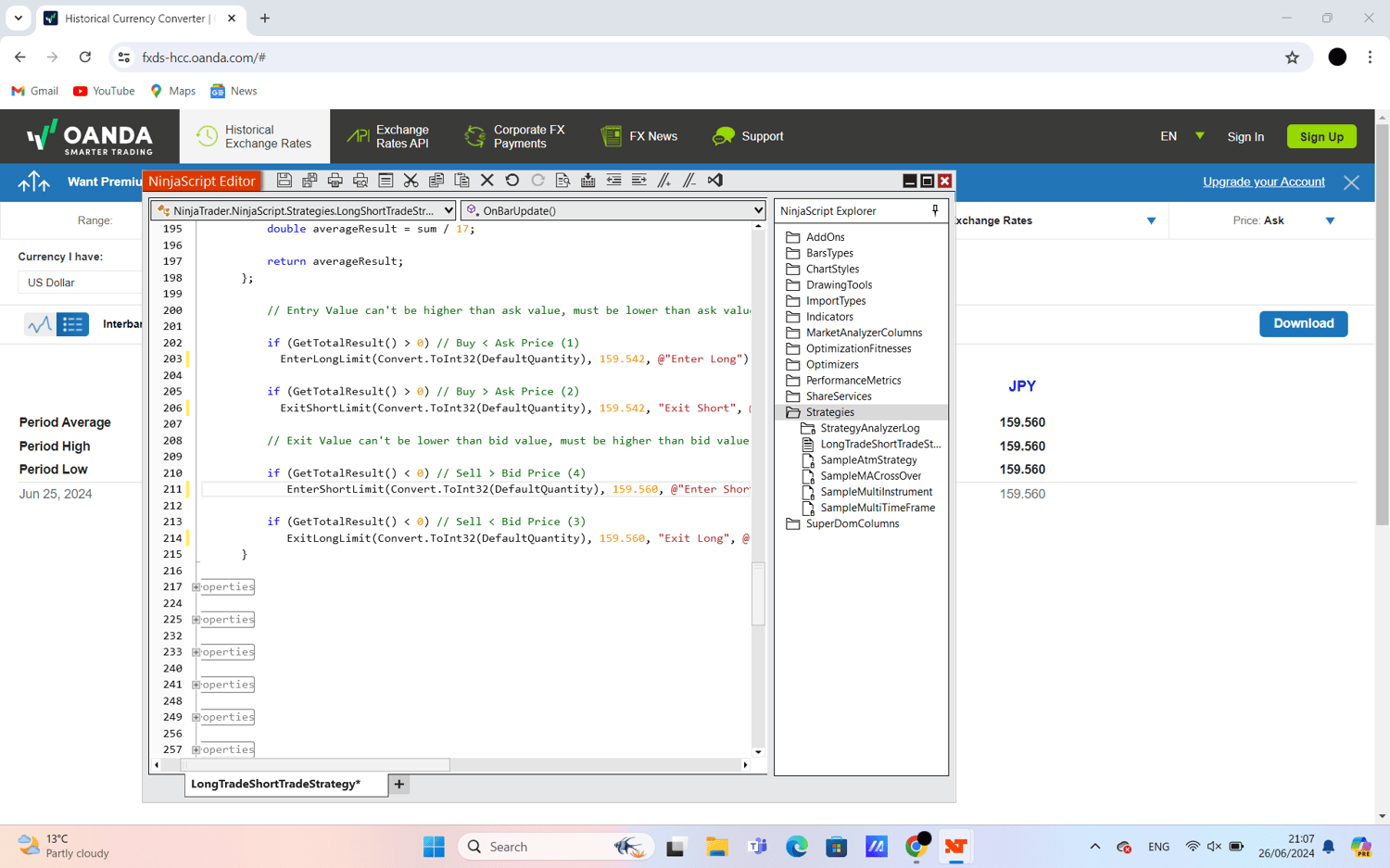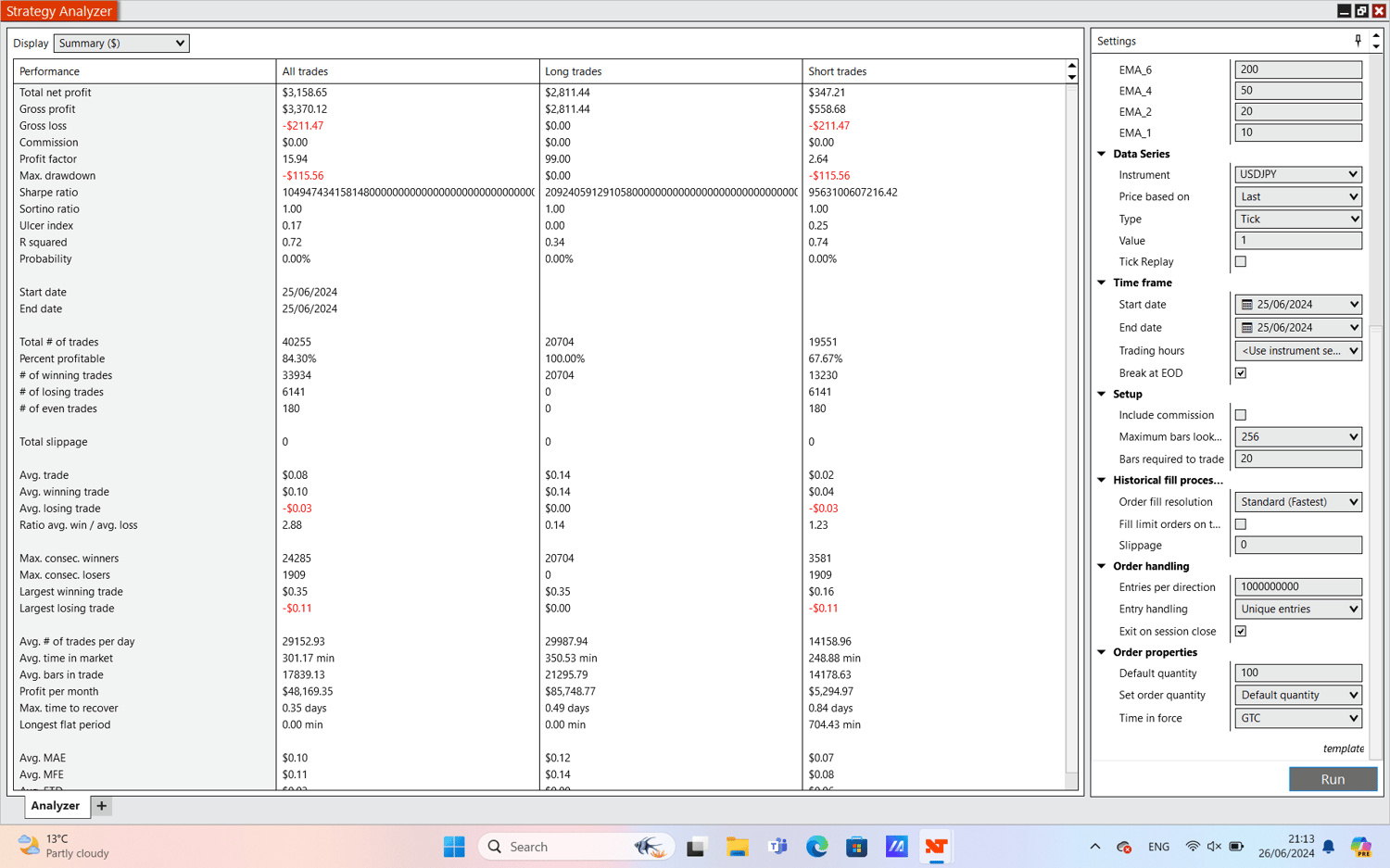 This NinjaTrader strategy, LongShortTradeStrategy, uses several indicators like moving averages and oscillators to automatically decide when to buy or sell stocks. It looks at these indicators compared to the current price of the stock to figure out if it's a good time to make a trade. When it sees indicators suggesting the stock might go up, it sets an order to buy at a price lower (buy limit order) than what others are currently willing to pay. If the indicators show the stock might drop, it sets an order to sell at a price higher than what others are offering (sell limit order). This strategy aims to make trades based on clear signals while adjusting its settings to try and do well in different market conditions.