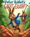 Peter Rabbit is a young, mischievous rabbit with soft, brown fur and long, floppy ears that twitch with curiosity. He has bright, intelligent eyes that sparkle with a hint of mischief, and a tiny pink nose that twitches when he's excited. He wears a bright blue jacket with shiny brass buttons, although it's often a bit rumpled from his adventures. He is nestled safely back in his burrow with his mother and siblings, Flopsy, Mopsy and Cottontail. They have soft, brown fur and long, floppy ears that twitch with curiosity. They have kind, gentle eyes. He's wrapped in a cozy blanket, sipping chamomile tea, with a weary but content expression. The burrow is warm and inviting, lit by the soft glow of a crackling fireplace. The scene exudes a feeling of safety, comfort, and family love. Include the text "The End" and "Thank you for reading!"