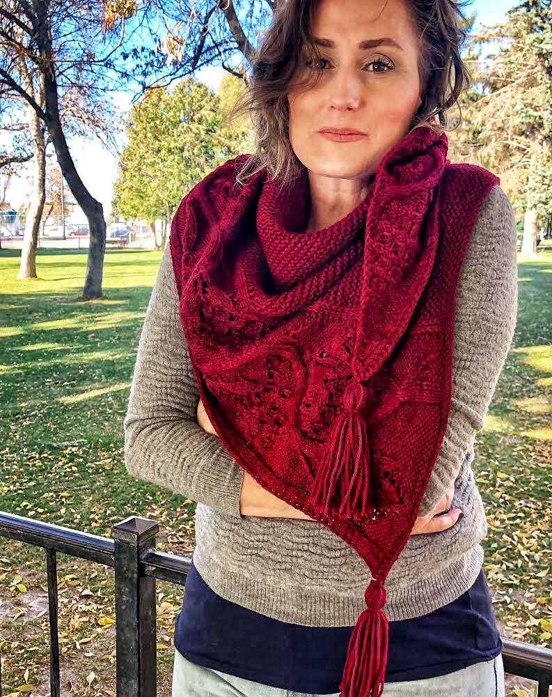 If you can’t tell, I’m a Greek mythology nerd and also a wine lover. I’ve had this shawl design brewing in my head since I started designing knitwear in 2016, but I hadn’t come across the perfect yarn to make it a reality – until I saw Fleece Artist’s Chinook base in their stunning Wine colorway, that is! I was so happy to get to knit my sample in this yarn – the color is rich and vibrant, and the yarn itself is squishy, soft, and has an excellent stitch definition.