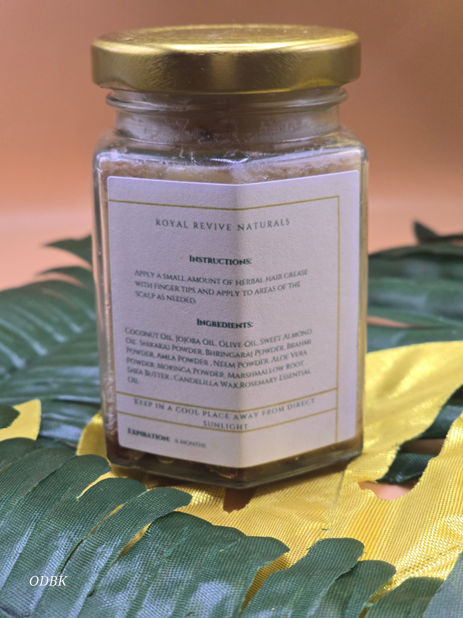 Ayurveda Herbs : Bhringraj a powerhouse herb stimulates hair follicles, promoting growth and preventing premature greying.Brahmi herb improves blood circulation to the scalp, strengthening hair follicles and fostering growth.Alma nourishes hair follicles, strengthens hair strands, and promotes growth.Fenugreek seed rich in protein, vitamins, and folic acid nourishes the scalp and accelerate hair growth. It aids in strengthening hair roots and stimulating hair follicles for hair growth. Thus, it prevents hair loss. Due to its moisturizing property, it also aids in adding sheen to one's hair.Shikakai herb, which is packed with important vitamins such as Vitamin A, K and E which are all beneficial in maintaining hair health.Neem Powder increases the growth rate of hair and adds strength and lustre to hair. Aloe Vera Powder contains proteolytic enzymes, which are beneficial in repairing dead cells on the scalp. Aloe vera aids in conditioning, nourishing, and reducing itchiness and dandruff. Moringa Powder is rich in vitamins and minerals that are essential for healthy hair, including vitamin A, B vitamins, vitamin C, vitamin E, iron, and zinc. These nutrients work together to nourish hair follicles, strengthen hair strands, and improve the overall health of your hair. Marshmallow Root disentangles and softens hair. It is a plant high in protein, thus promoting healthy hair growth, moisturizing dry hair, and a soothed, cool scalp. This herbal hair grease is scented with rosemary and lavender essential oil, which also promotes hair stimulation and growth.