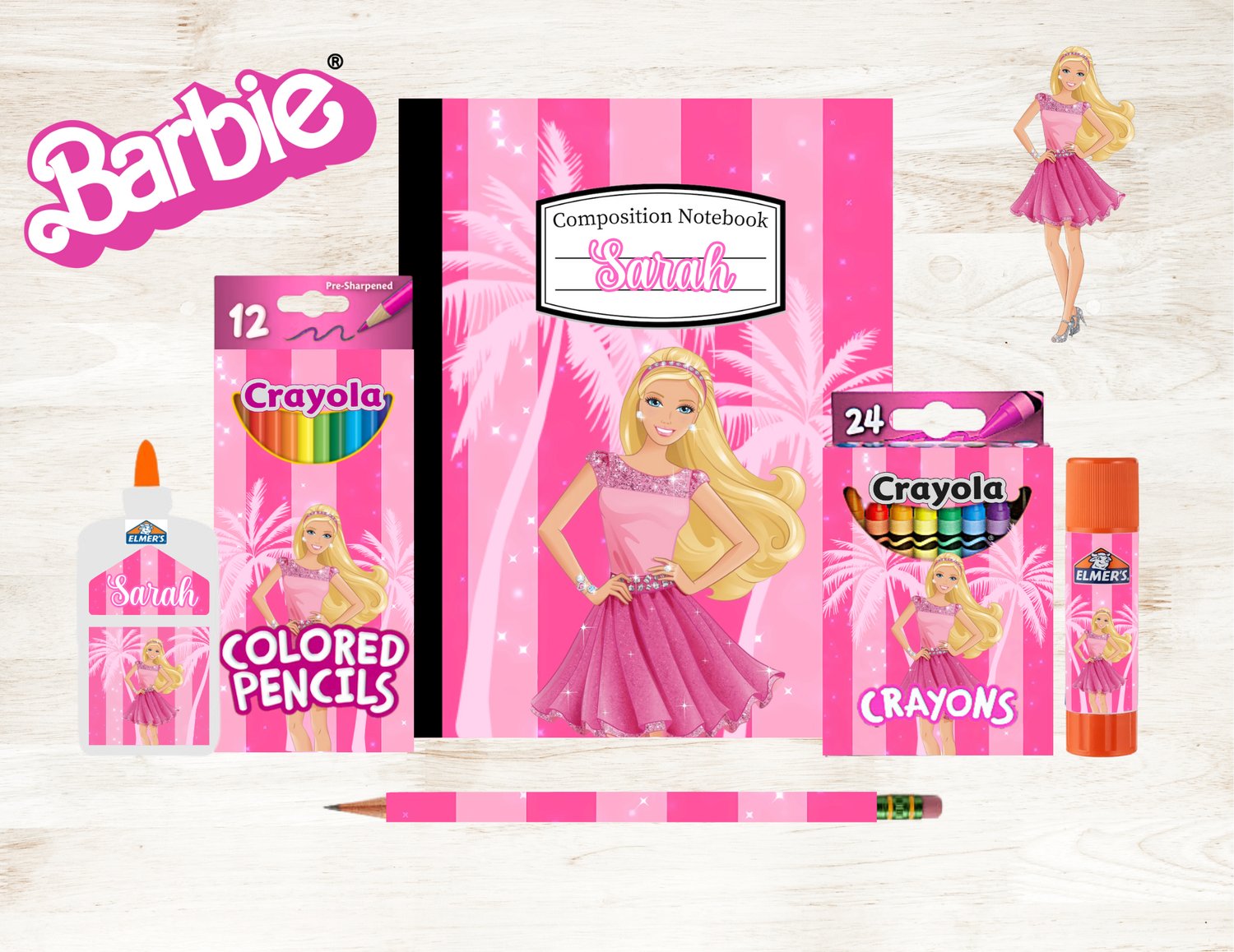 Personalized Barbie School Supplies Set | Custom Name Notebook + Crayons, Pencils & Glue | Barbie Themed Back-to-School Kit