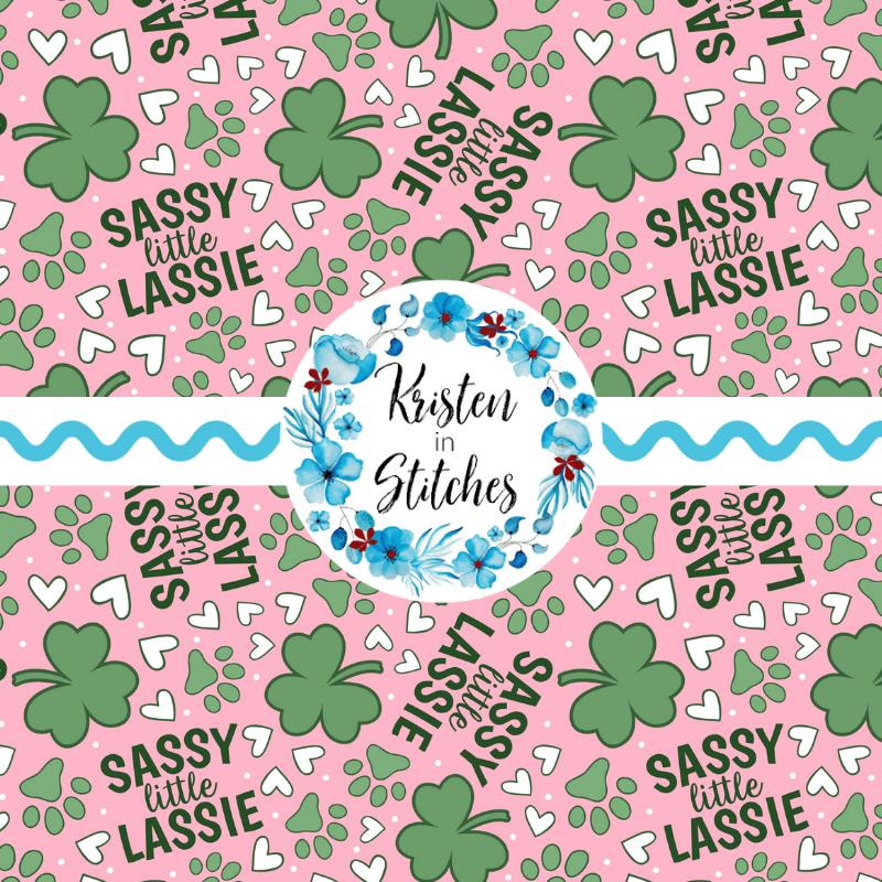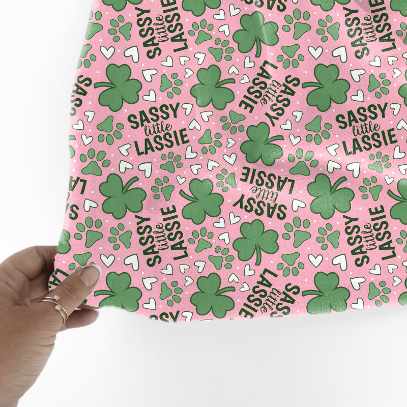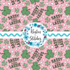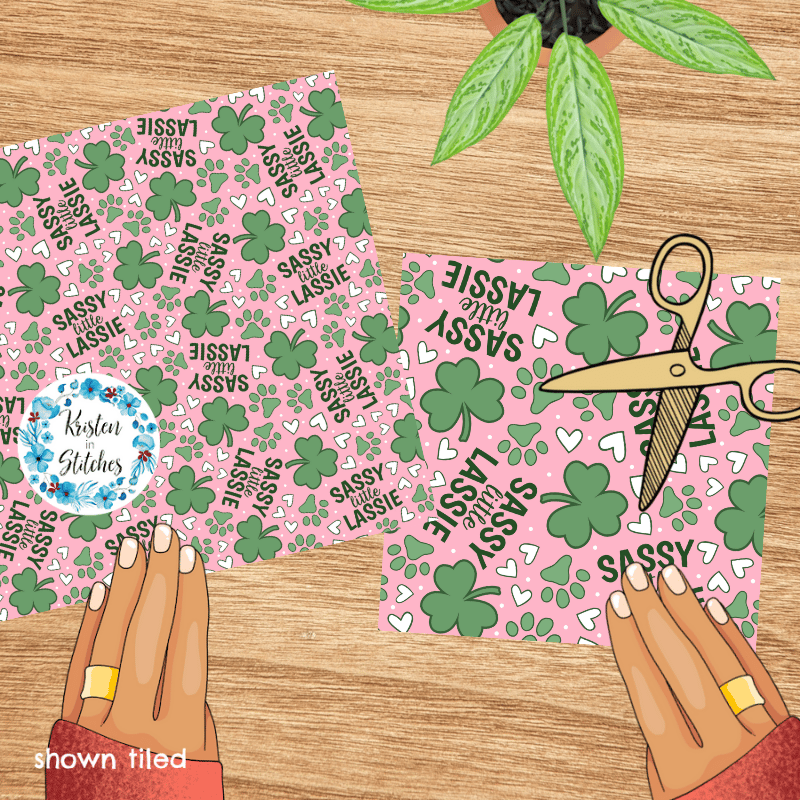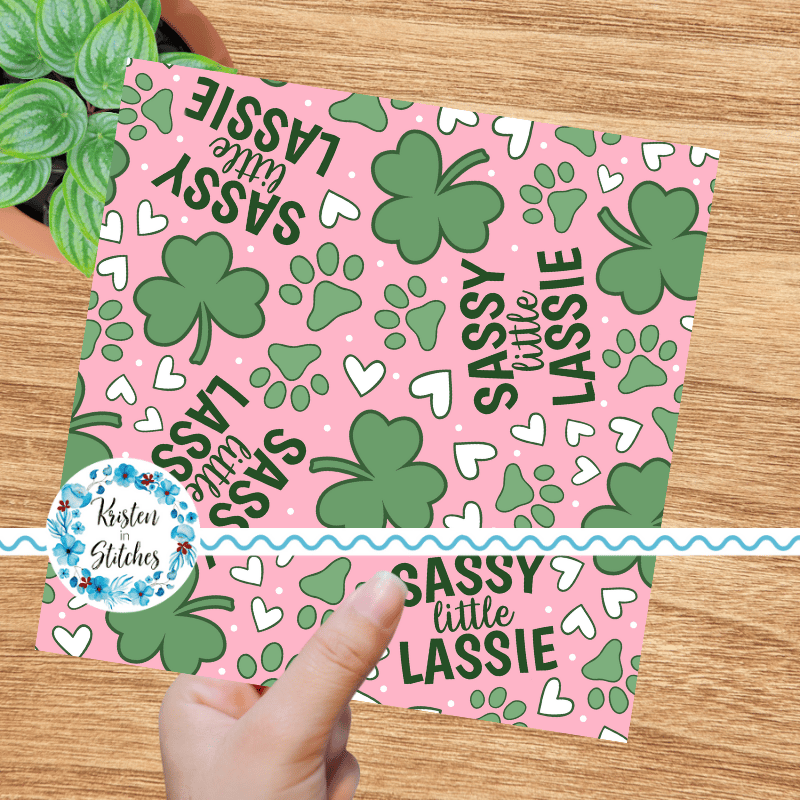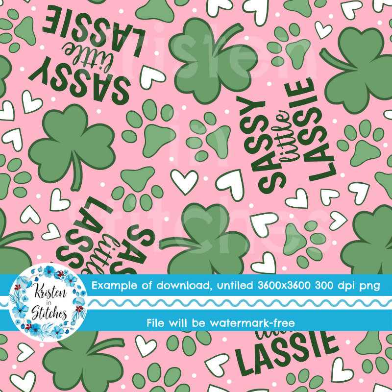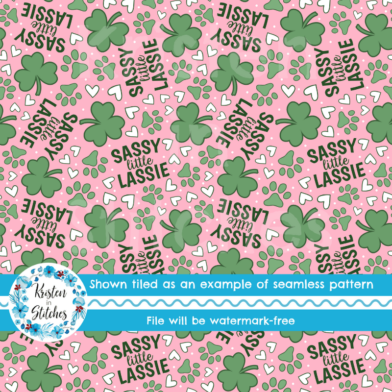 Sassy Little Lassie St. Patrick's Day Seamless Pattern, Shamrocks Hearts Dog Paw Prints