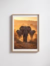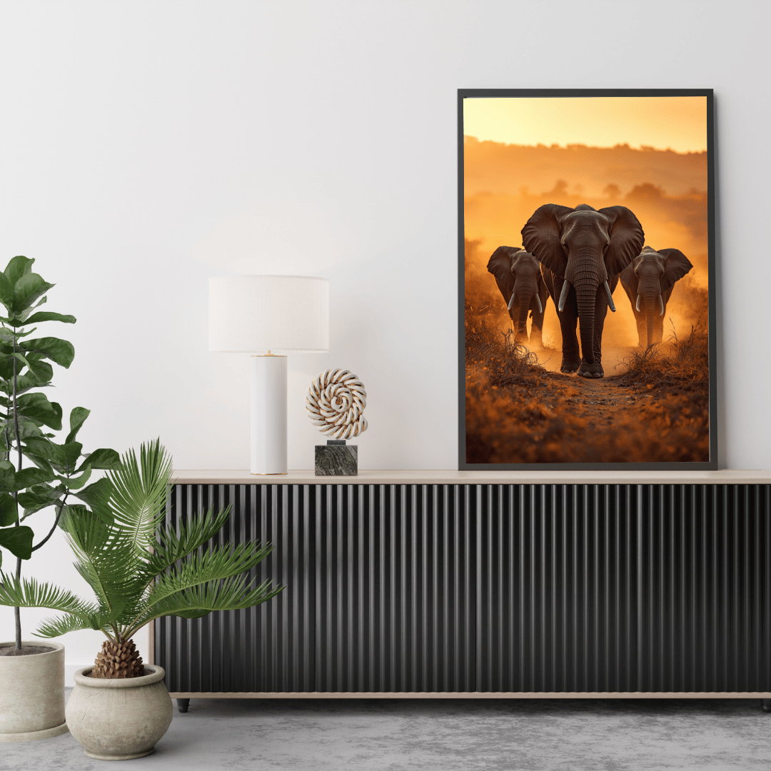 Create a bold, emotional focal point in your space with this majestic elephant wall art printable. Capturing a powerful moment of an elephant family walking through the African landscape at golden hour, this artwork evokes strength, unity, and natural beauty.