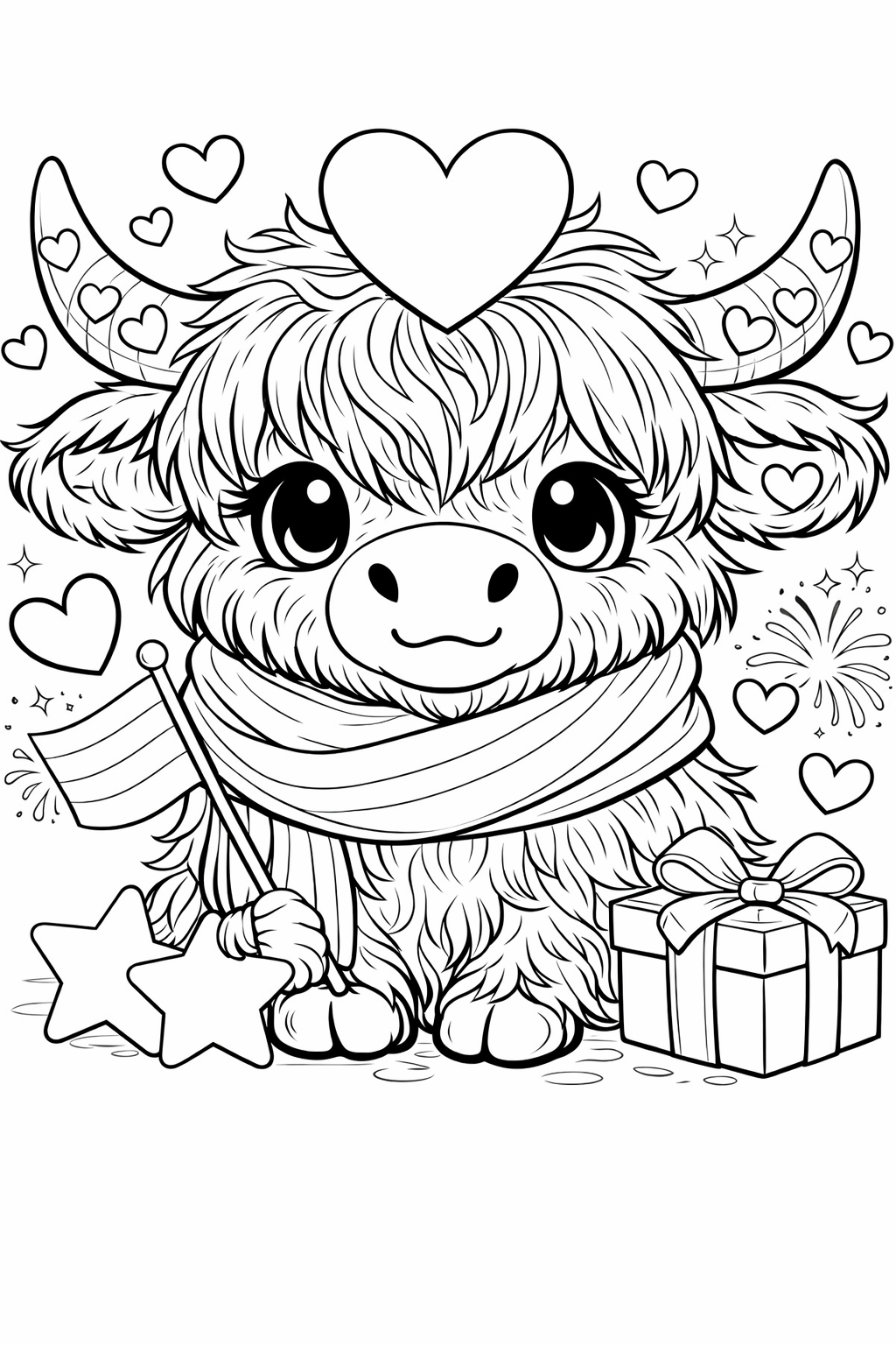 In this adorable Pride-themed coloring page, Bella Moo is wrapped in a rainbow scarf, holding a Pride flag, and surrounded by hearts, sparkles, and festive fun. This cozy Highland cow design is perfect for kids, teens, and adults who love cute characters and positive vibes.