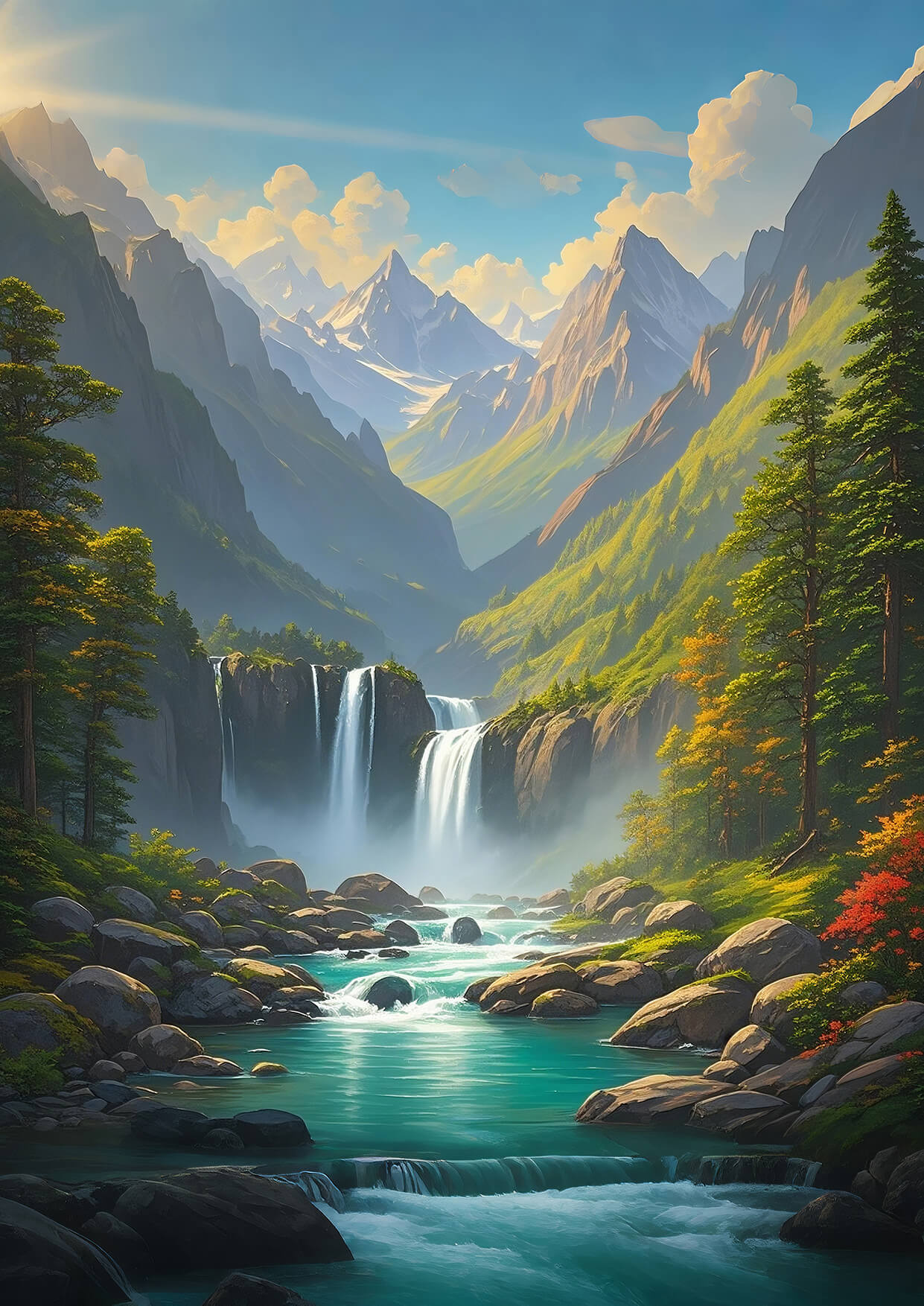 This high-resolution digital art features a majestic waterfall flowing from snowy mountain peaks, embraced by lush green forests and a turquoise river. In Feng Shui, mountains represent stability and protection, waterfalls symbolize wealth and abundance, blue evokes calm and wisdom, and green enhances growth and health. Perfect for creating a harmonious, prosperous space.